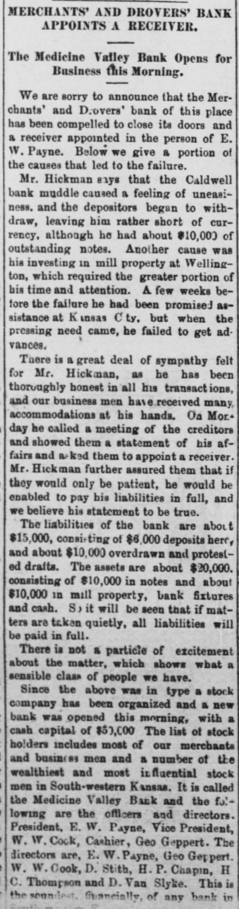 MERCHANTS' AND DROVERS' BANK APPOINTS A RECEIVER. The Medicine Valley Bank Opens for Business this Morning. We are sorry to announce that the Merchants' and Drovers' bank of this place has been compelled to close its doors and a receiver appointed in the person of E. W. Payne. Below we give a portion of the causes that led to the failure. Mr. Hickman says that the Caldwell bank muddle caused a feeling of uneasiness. and the depositors began to withdraw, leaving him rather short of currency, although he had about $10,000 of outstanding notes. Another cause was his investing in mill property at Wellington, which required the greater portion of bis time and attention. A few weeks before the failure he had been promised assistance at Kinsas City. but when the pressing need came, he failed to get ad. vances. There is a great deal of sympathy felt for Mr. Hickman, as he has been thoroughly honest in all his transact ions, and our business men have received many accommodations at his hands. Oa Mor. day he called a meeting of the creditors and showed them a statement of his affairs and asked them to appoint a receiver. Mr. Hickman further assured them that if they would only be patient, he would be enabled to pay his liabilities in full, and we believe his statement to be true. The liabilities of the bank are about $15,000, consisting of $6,000 deposits here, and about $10,000 overdrawn and protested draits. The assets are about $20,000. consisting of $10,000 in notes and about $10,000 in mill property, bank fixtures and cash. S, it will be seen that if matters are taken quietly, all liabilities will be paid in full. There is not a particle of excitement about the matter, which shows what a sensible class of people we have. Since the above was in type a stock company has been organized and a new bank was opened this morning, with a cash capital of $50,000 The list of stock holders includes most of our merchants and business men and a number of the wealthiest and most influential stock men in South-western Kansas. It is called the Medicine Valley Bank and the fo:lowing are the officers and directors. President, E. W. Payne, Vice President, W. W. Cock, Cashier, Geo Geppert. The directors are, E. W. Payne, Geo Geppert. W. W. Cook, D. Stith, H. P. Chapin, H C. Thompson and D. Van Slyke. This is the soundest. financially, of any bank in