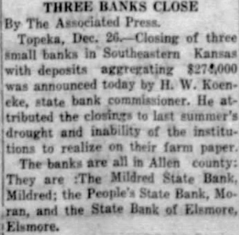 Amor Jefferis, who is a student in the Kansas State Teachers college, Pittsburg, and Mr. and Mrs. Paul Iden, Iola, spent the week end at the parental James Jefferis home. Mr. and Mrs. Brooks Wallace spent Thursday with Mrs. Mary E. Walker and Sam Wallace. Rev. J. C. Lane called at Mont Miller's Friday afternoon. Mr. and Mrs. George Ruxton drove to Iola Friday. Mrs. J. D. Land. Kansas City, sister of Mrs. Mont Miller. had her tonsils removed at the Iola hospital last week. Mrs. Wood and son, of Moran, helped Mrs. George McCormack celebrate her birthday Friday by eating supper with her at the M. Keeton home. Johnnie Williams and family were visitors at A. D. Switzer's Thursday evening. John Haberbosch, who is attending school at Erie, spent the week end at home. Arthur Hizey, Bronson. spent Sunday with his sister, Mrs. A. D. Switzer and family, Sunday C. W. Dean and his daughter, Mrs. Melba McDonald. have moved back to Mildred. Melba was our popular central for some time and made friends of all Mr. Dean has held a position with the cement plant here for several years and their many friends are glad to welcome them back to Mildred. Mr. and Mrs. Mont Miller spent Friday evening at the Ater home. Our little town has taken on quite a busy "air," the streets being filled with cars morning and evenings and many people have opened up their homes to accommodate the men. A gas line is being laid, coming into town from the north, and the cement road is being extended several miles north. The road between here and Kincaid will be shortened, the new road going past the cement plant. Two forces of men are here for the road work, the bridge gang and the road gang, and with the pipe line men, our eating houses are taxed to their utmost capacity and a number of private homes are taking boarders. Every day large number of men come in to try to get jobs. Monday morning there was string of cars two miles long between here and Kincaid-men hunting work. Both the boys' and girls' teams of our high school went to LaHarpe Friday night and played the LaHarpe high school. Both teams came home victorious, the score in the girls' game being 34-47 and the boys' game, 21-19. This is the second league game our folks have won. They will play Uniontown here Friday night. Jim Doggett and family and Mr Goodwin and family were visitors at A. D. Switzer's Thursday evening. Mrs. C. S. Fowler and Irene, Gas, visited Mrs. A. D. Switzer Monday Jerome Caron has returned from the veterans' hospital in Kansas City where he had an operation performed on his throat. Frank and Meribeth Ater ate supper at Hank McAdams Thursday evening. Mr. and Mrs. Bill Moore and Mr. and Mrs. Roland Chandler have moved to Mildred and opened a restaurant in the Dudley building. O. A. Young, Moran. has been appointed receiver for the Mildred and Moran banks, and he has appointed "Babe" Nevitt to look after the business here. Mr. Keetom and "Babe" are both honest, upright men, who have the confidence of all, and the depositors are much pleased that "Babe" will look after the business. It is still hoped that the bank can be reorganized and go on. as Mildred needs a bank. Without a bank business interests would be drawn away from town. An infant child of Mr. and Mrs. Ray Ewing, Thayer, was brought here Monday for burial in the Fairview cemetery Miss Fawn Miller entertained the junior class of the Kincaid high school at her home north of town. Friends here have received word from the Garretsons asking them to go to Lone Elm and hear Rev. and Mrs. Calkins who are conducting a revival there. Rev. Mr. Calkins conducted a revival for Rev.