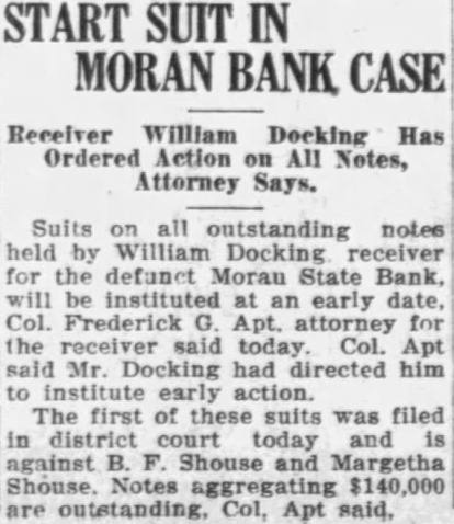 In Moran Sanders paid $525 the bank more than This made April 1926, Mr. Bone that public sale, Sanders highest and that the sale by the At time the Moran sale made William Docking the genreceiver the banking partment and Dickinson was deputy turned over Mr. Sanders. Also, Mr. said today his that May number notes from Spring Hill bank, paying $350 them. explained that all assets this bank were offered and only bid whole Then Sanders was mitted through the papers or notes and them for reported that at another time. the Gilbert Frith the bank that had failed Dwight, but did get what they Bone said that, far as knew Mr. Sanders did bid assets the Central State bank Kansas City, when more than worth assets sold than $2,000. Recommendation Gets Job.