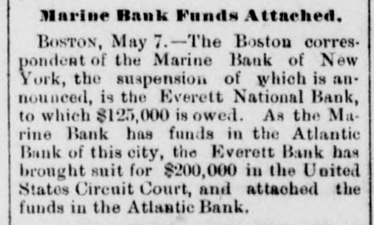 The Marine Bank. BOSTON, May 6.-The Boston correspondent of the Marine bank of New York whose suspension is announced this afternoon,is the Everett National bank to which less than $125,000 is owed. As the Marine bank has funds in the Atlantic bank of this city the Everett has this afternoon brought suit for $200,000 in the United States circuit court and attached the funds in the Atlantic bank. NEW YORK, May 6.-The Tribune the of account its in failure of the Marine bank will say to-morrow: The bank opened its doors at the usual hour and several deposits were received. About 11 o'clock the directors held their regular weekly meeting and transacted routine business, such as discounting notes, etc. Nothing was mentioned at the meeting by any officer about the coming trouble or its financial complications. An adjournment was taken as soon as the matters that were before the direct rs were disposed of. Those who had been present went to their places of business except two or three directors, wbo attended theopening ceremonies at the new produce exchange building. Shortly before noon the cashier received word from President Fish to stop doing business and close the bank doors. The great iron shutters were hauled down. MONTREAL, Mav 6.-A very uneasy feeling prevails this afternoon owing to the failure of the New York Marine National bank. Grant & Ward, stock brokers, are also among the failures. Over the border these reverses are more keenly felt than here, owing to the prevailing stagnation of business through Canada.
