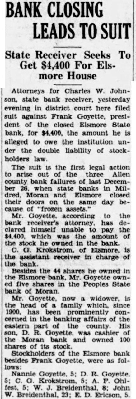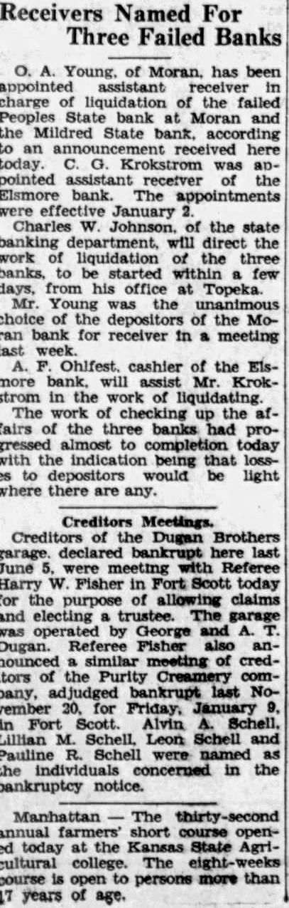 WITHDRAWA CAUSE FIVE BANKS TO CLOSE Dec 26 -Closing of three small banks Kansas with deposits announced today by State Bank He attributed the closings to Summer's and inability of the to realize on their farm paper The banks are all Allen County They are The Mildred State Bank Mildred: the People's State Bank Moran, and the State Bank of Elsmore Elemore Savings Bank here to open today end notice posted on the door had been placed charge the State of banks the said the closing was to Ind Dec The State of $50,000 was closed of today heavy was the State The surplus $30,000 and loans and discounts