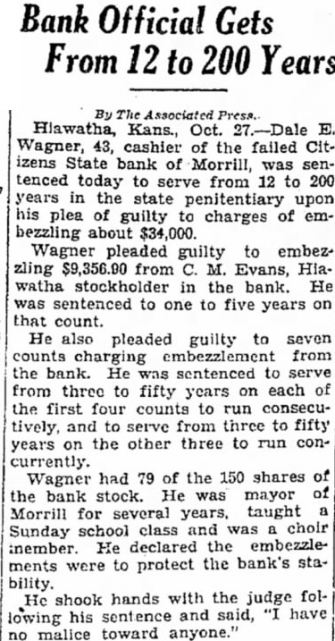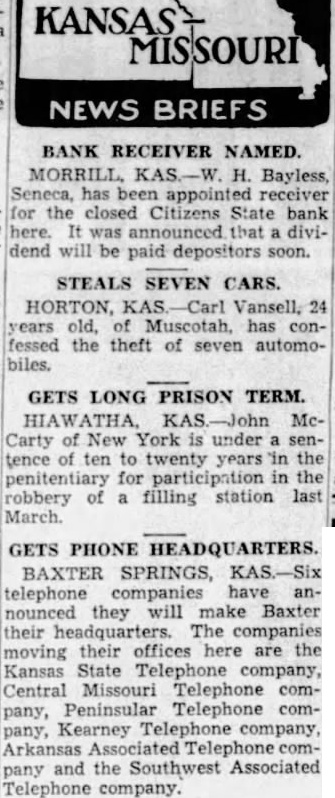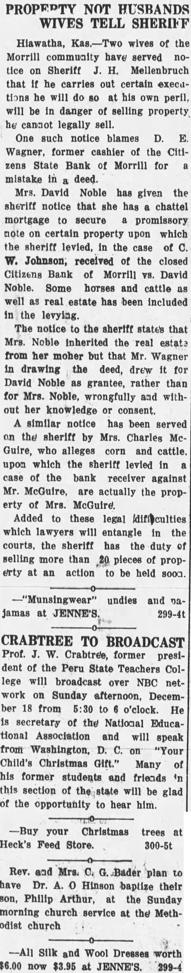 Hiawatha, Kas.-Two wives of the Morrill community have served notice on Sheriff J. H. Mellenbruch that if he carries out certain executions he will do 80 at his own peril, will be in danger of selling property he cannot legally sell. One such notice blames D. E. Wagner, former cashier of the Citizens State Bank of Morrill for a mistake in deed. Mrs. David Noble has given the sheriff notice that she has a chattel mortgage to secure a promissory note on certain property upon which the sheriff levied, in the case of C. W. Johnson, received of the closed Citizens Bank of Morrill VS. David Noble. Some horses and cattle as well as real estate has been included in the levying. The notice to the sheriff states that Mrs. Noble inherited the real estate from her moher but that Mr. Wagner in drawing the deed, drew it for David Noble as grantee, rather than for Mrs. Noble, wrongfully and without her knowledge or consent. A similar notice has been served on the sheriff by Mrs. Charles McGuire, who alleges corn and cattle. upon which the sheriff levied in a case of the bank receiver against Mr. McGuire, are actually the property of Mrs. McGuire. Added to these legal difficulties which lawyers will entangle in the courts, the sheriff has the duty of selling more than 20 pieces of property at an action to be held soon. jamas at JENNE'S