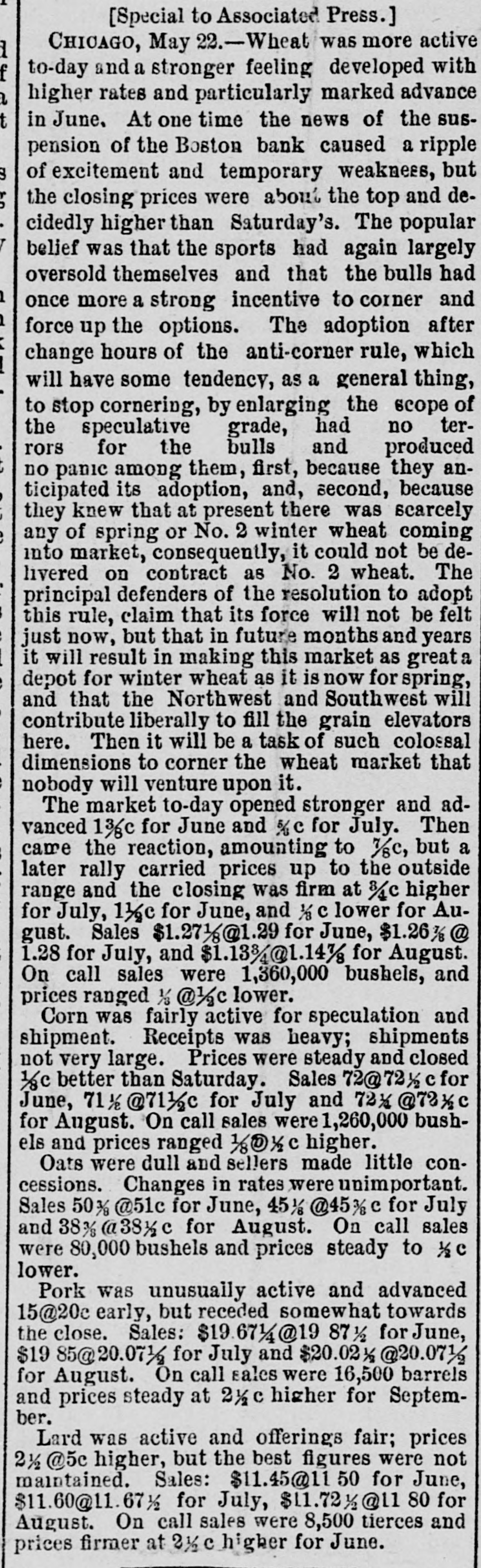 [Special to Associated Press.] CHICAGO, May 22.-Wheat was more active to-day and a stronger feeling developed with higher rates and particularly marked advance in June, At one time the news of the suspension of the Boston bank caused a ripple of excitement and temporary weakness, but the closing prices were about the top and decidedly higher than Saturday's. The popular belief was that the sports had again largely oversold themselves and that the bulls had once more a strong incentive to corner and force up the options. The adoption after change hours of the anti-corner rule, which will have some tendency, as a general thing, to stop cornering, by enlarging the scope of the speculative grade, had no terrors for the bulls and produced no panic among them, first, because they anticipated its adoption, and, second, because they knew that at present there was scarcely any of spring or No. 2 winter wheat coming into market, consequently, it could not be delivered on contract as No. 2 wheat. The principal defenders of the resolution to adopt this rule, claim that its force will not be felt just now, but that in future months and years it will result in making this market as great depot for winter wheat as it is now for spring, and that the Northwest and Southwest will contribute liberally to fill the grain elevators here. Then it will be a task of such colossal dimensions to corner the wheat market that nobody will venture upon it. The market to-day opened stronger and advanced 13/c for June and % for July. Then came the reaction, amounting to T/C, but a later rally carried prices up to the outside range and the closing was firm at 8/4 higher for July, 11/cc for June, and 1/1/2 c lower for August. Sales $1.271/@1.29 for June, $1.26% @ 1.28 for July, and $1.133/@1.14% for August. On call sales were 1,360,000 bushels, and prices ranged 1/3 @1/3c lower. Corn was fairly active for speculation and shipment. Receipts was heavy; shipments not very large. Prices were steady and closed 1/cc better than Saturday. Sales 72@72%cfor June, 71% @711/2c for July and 72%@73%c for August. On call sales were 1,260,000 bushels and prices ranged 1/1/1c higher. Oats were dull and sellers made little concessions. Changes in rates were unimportant. Sales 50% @51c for June, 45 1/6 @45% c for July and 8(3381/c for August. On call sales were 80,000 bushels and prices steady to 1/2c lower. Pork was unusually active and advanced 15@20c early, but receded somewhat towards the close. Sales: $19.6714@19 87 for June, 19 85@20.07}/ for July and $20.02 % @20.07}/ for August. On call sales were 16,500 barrels and prices steady at 2 1/1 c higher for September. Lard was active and offerings fair; prices 2 1/25@c higher, but the best figures were not maintained. Sales: $11.45@11 50 for June, $11.60@11.67% for July, $11.72 % @11 80 for August. On call sales were 8,500 tierces and prices firmer at 21/2 higher for June.