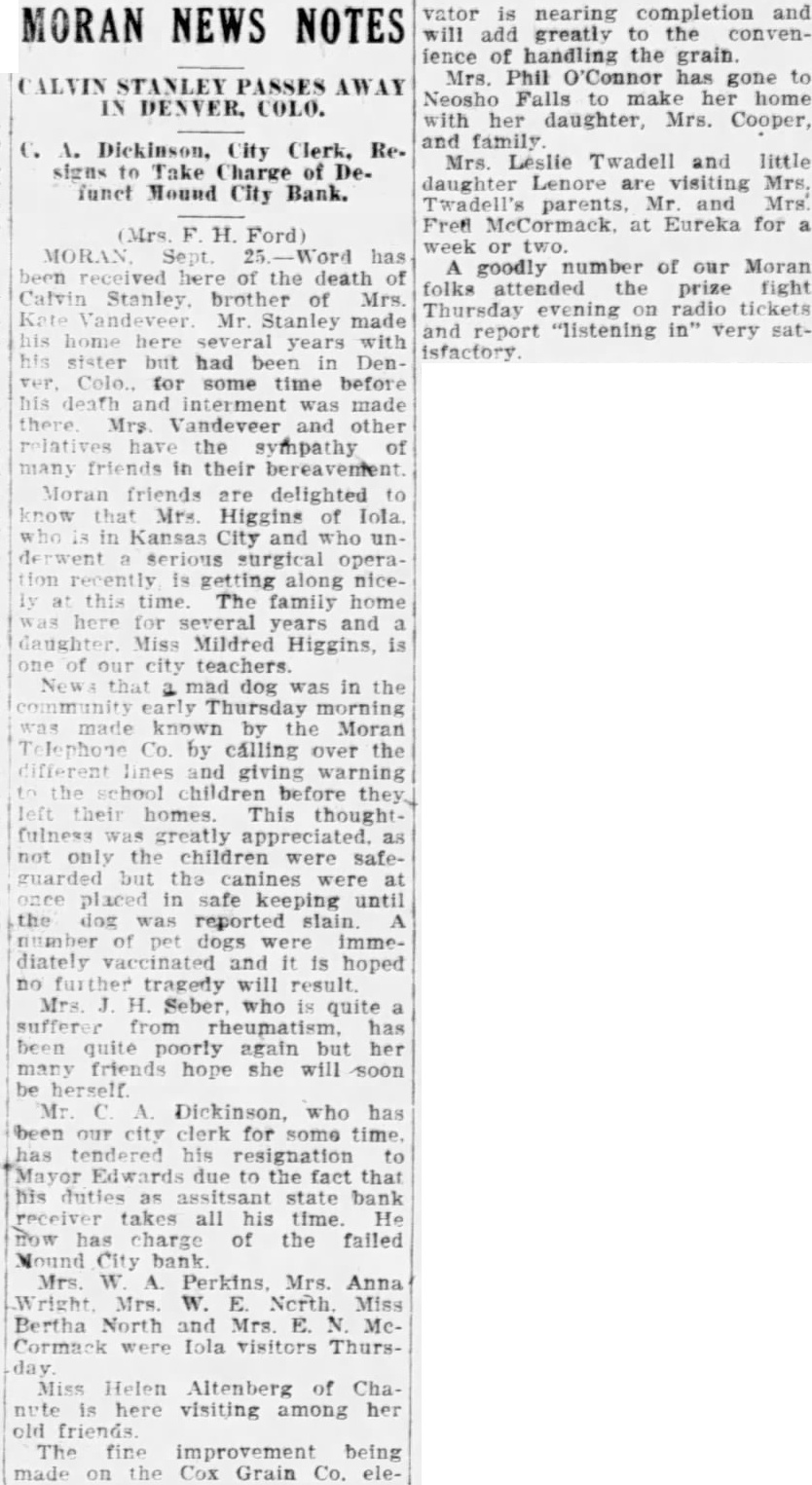 MORAN NEWS NOTES STANLEY PASSES IN DENVER. COLO. Dickinson. City Clerk, Resigns Take Charge of Defunct Mound City Bank. (Mrs. Ford) MORAN Sept. has been received here of the death of Calvin Stanley. brother of Mrs. Mr. Stanley made home here years with sister but had been DenColo. for some time before death and interment made there Mrs Vandeveer and other the sympathy of friends in their Moran friends delighted know that Mrs. Higgins of Iola. in Kansas City and unserious surgical operarecently getting along nicethis time. The family home for several years and daughter. Miss Mildred Higgins, city teachers. that mad dog was in the Thursday morning made known Moran Co. by calling over the different lines and giving warning children before they their homes. This thoughtfulness greatly appreciated. only the children were safeguarded but the canines were placed in safe keeping until the dog was reported slain dogs diately vaccinated and hoped tragedy will result Mrs. Seber who quite from rheumatism, has been quite poorly again her many friends hope she will soon who has been our clerk for some time. tendered his resignation to Mayor Edwards due to the fact that his duties assitsant state bank takes all his time He now charge of the failed Mound City bank Mrs. Mrs. Anna Mrs. Miss Bertha North and Mrs. E. McCormack Iola visitors ThursMiss Helen Altenberg of Chanute here visiting among her friends. The fine improvement being made the Cox Grain Co. vator nearing completion and will add greatly to the convenience of handling the grain. Mrs. Phil O'Connor gone Neosho Falls to make home with her daughter, Mrs. Cooper, and family Mrs. Leslie Twadell and little daughter Lenore are visiting Mrs. Twadell's parents, Mr and Mrs. Free McCormack. at Eureka for week or two. goodly number of our Moran folks attended the prize fight Thursday evening radio tickets and report "listening very isfactory