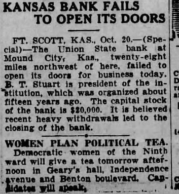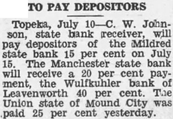 Chas. W. Johnson, former Dwight banker who is now state bank receiver, made an announcement today that is of terest one local minister. He fixed Feb. 9th as the date for funding depositors in the Union State bank of Mound City 35 cent of their deposits on when the bank failed Oct. Rev. Congregational minister, had check at the bank when closed.