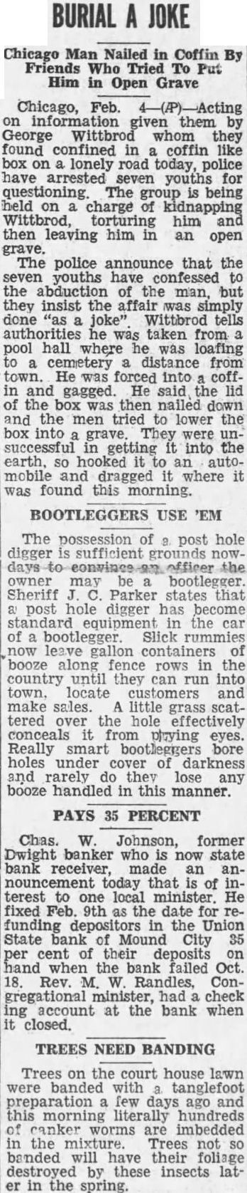 Chicago, Feb. on information given them by George Wittbrod whom they found confined in coffin like box on lonely road today, police have arrested seven youths for questioning The group is being on charge kidnapping Wittbrod, torturing him and then leaving him in an open grave. The police announce that the youths have to the abduction of the man, but they insist the affair was simply done joke" tells he was taken from hall where was loafing cemetery distance from was forced into coffand gagged. He said the lid the box was then nailed down and the men tried to lower the box into grave. They unsuccessful in getting it into the earth, so hooked to automobile and dragged where found this morning.