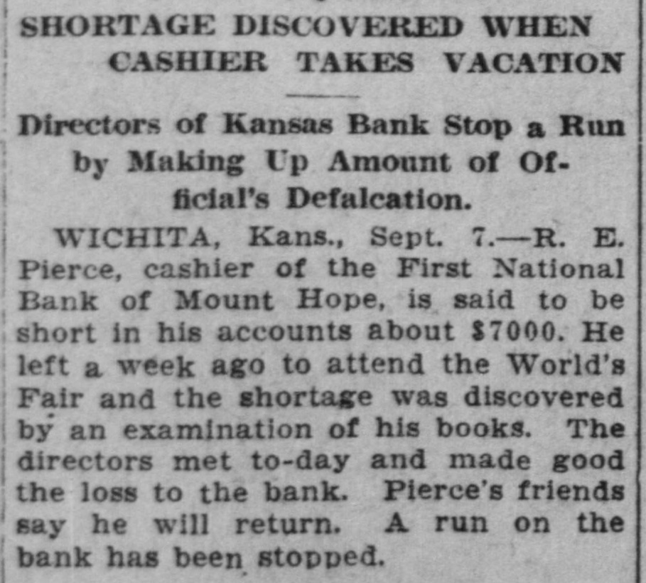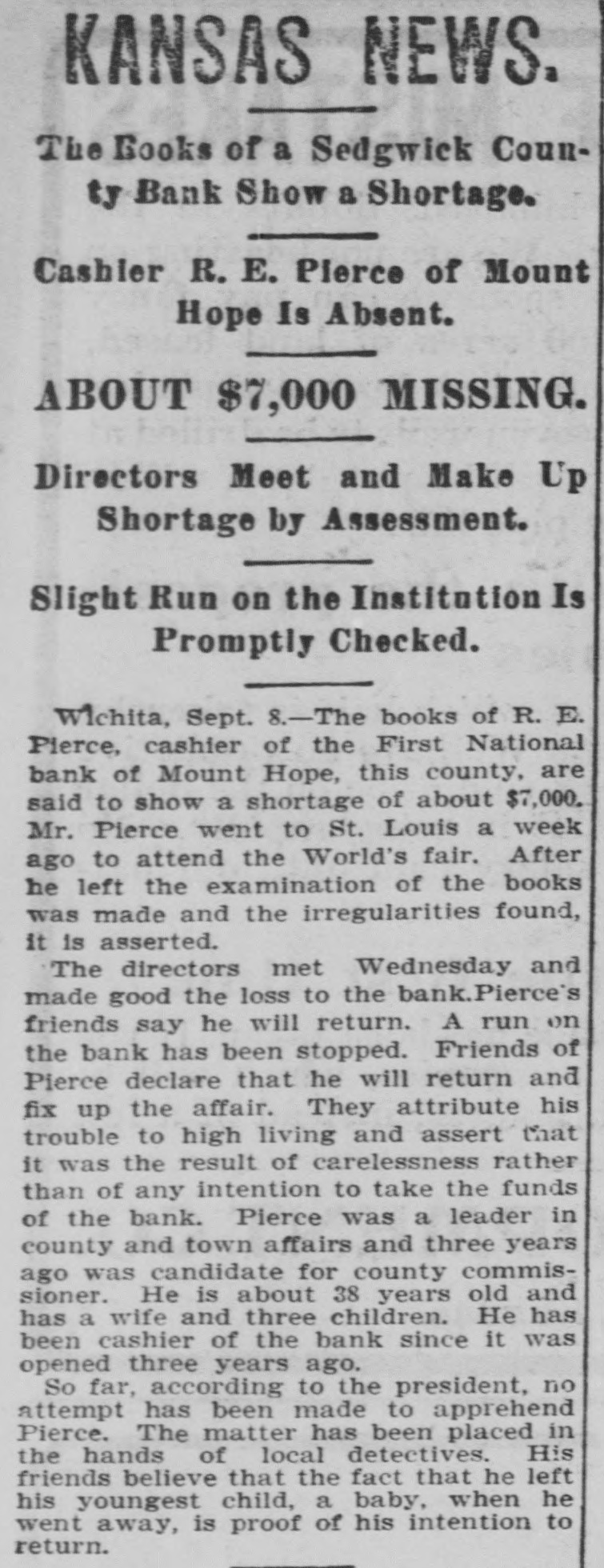 KANSAS NEWS. The Books of a Sedgwick County Bank Show a Shortage. Cashier R. E. Pierce of Mount Hope Is Absent. ABOUT $7,000 MISSING. Directors Meet and Make Up Shortage by Assessment. Slight Run on the Institution Is Promptly Checked. Wichita, Sept. 8.-The books of R. E. Pierce, cashier of the First National bank of Mount Hope, this county, are said to show a shortage of about $7,000. Mr. Pierce went to St. Louis a week ago to attend the World's fair. After he left the examination of the books was made and the irregularities found, it is asserted. The directors met Wednesday and made good the loss to the bank. Pierce's friends say he will return. A run on the bank has been stopped. Friends of Pierce declare that he will return and fix up the affair. They attribute his trouble to high living and assert that it was the result of carelessness rather than of any intention to take the funds of the bank. Pierce was a leader in county and town affairs and three years ago was candidate for county commissioner. He is about 38 years old and has a wife and three children. He has been cashier of the bank since it was opened three years ago. So far, according to the president, no attempt has been made to apprehend Pierce. The matter has been placed in the hands of local detectives. His friends believe that the fact that he left his youngest child, a baby, when he went away, is proof of his intention to return.
