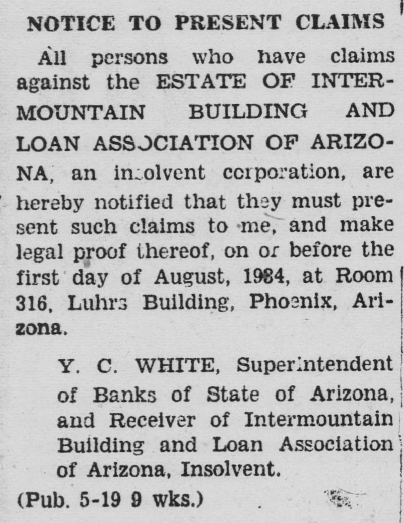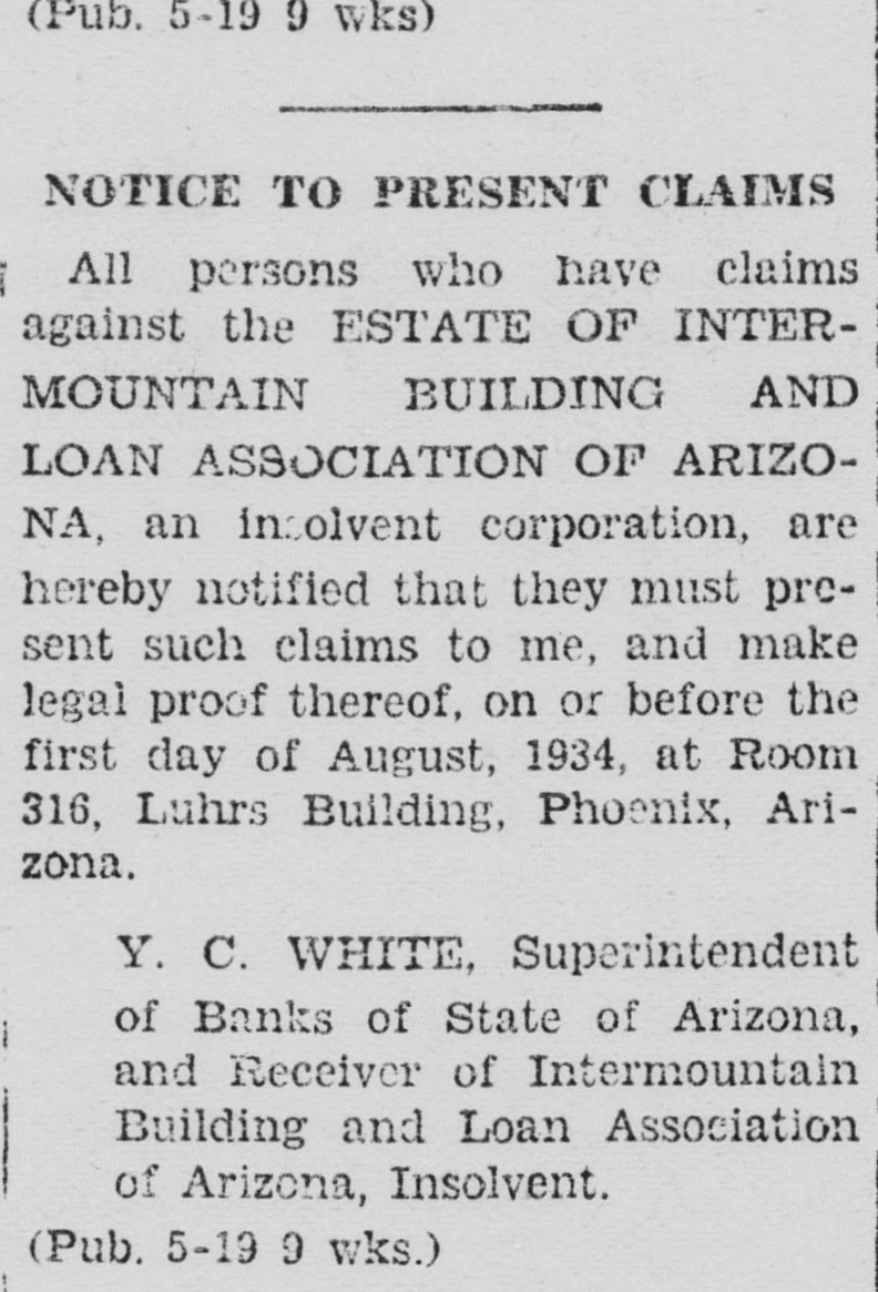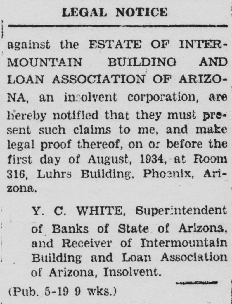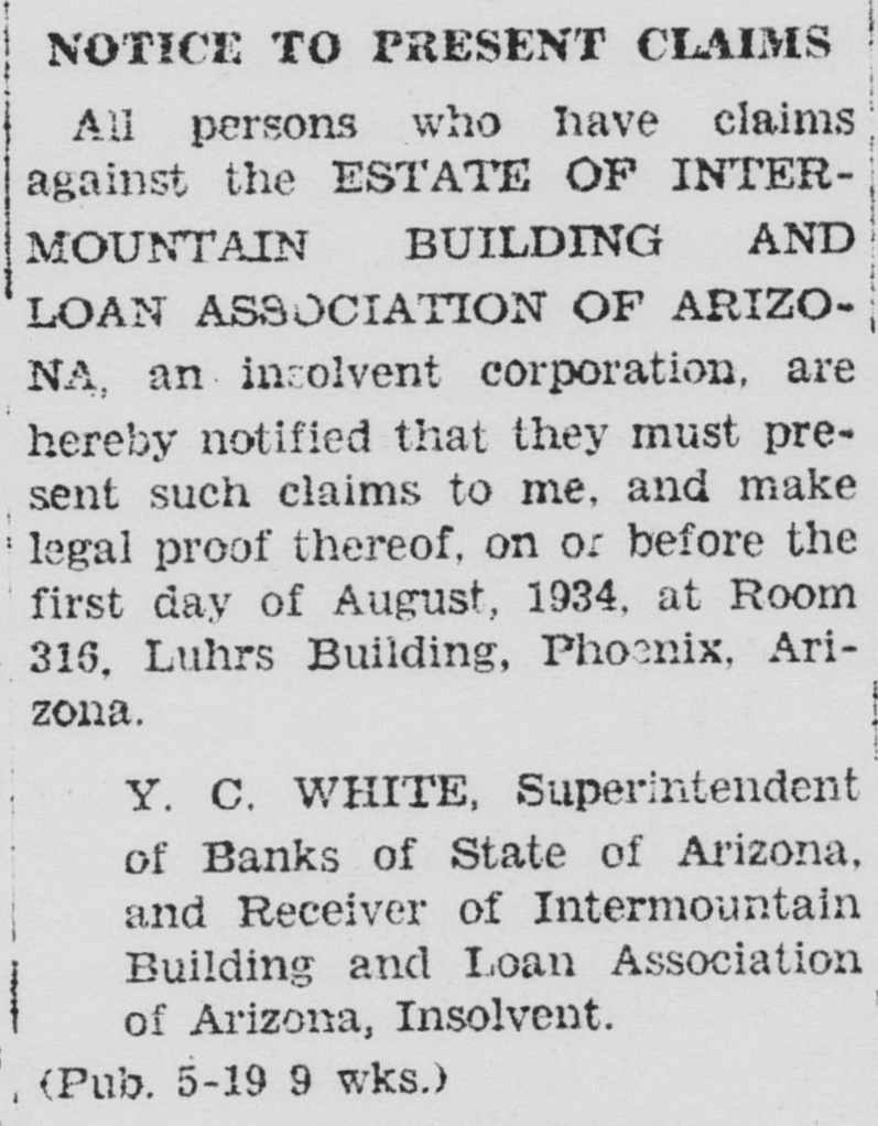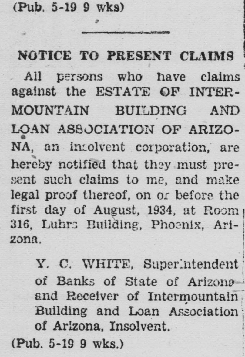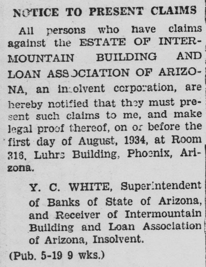 LEGAL NOTICE against the ESTATE OF INTERMOUNTAIN BUILDING AND LOAN ASSOCIATION OF ARIZONA, an insolvent corporation, are hereby notified that they must present such claims to me, and make legal proof thereof, on or before the first day of August, 1934, at Room 316, Luhrs Building. Phoenix, Arizona. Y. C. WHITE, Superintendent of Banks of State of Arizona, and Receiver of Intermountain Building and Loan Association of Arizona, Insolvent. (Pub. 5-19 9 wks.)