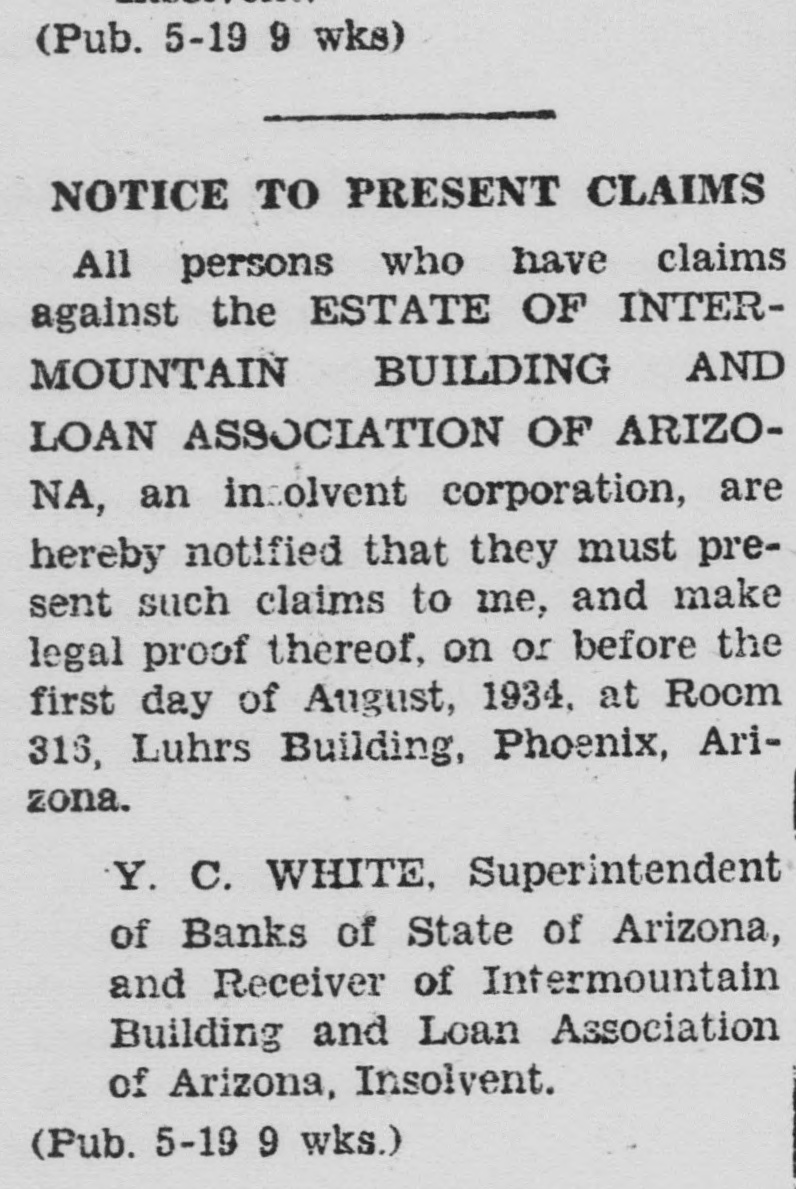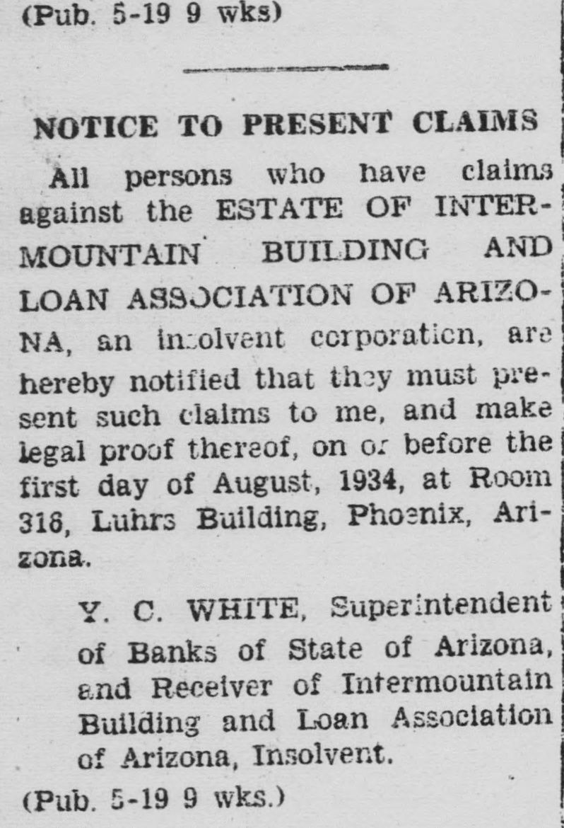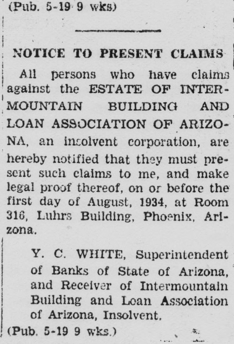 (Pub. 5-19 9 wks) NOTICE TO PRESENT CLAIMS All persons who have claims against the ESTATE OF INTERMOUNTAIN AND BUILDING LOAN ASSOCIATION OF ARIZONA, an insolvent corporation, are hereby notified that they must present such claims to me, and make legal proof thereof, on or before the first day of August, 1934, at Room 316, Luhrs Building, Phoenix, Arizona. Y. C. WHITE, Superintendent of Banks of State of Arizona, and Receiver of Intermountain Building and Loan Association of Arizona, Insolvent. (Pub. 5-19 9 wks.)