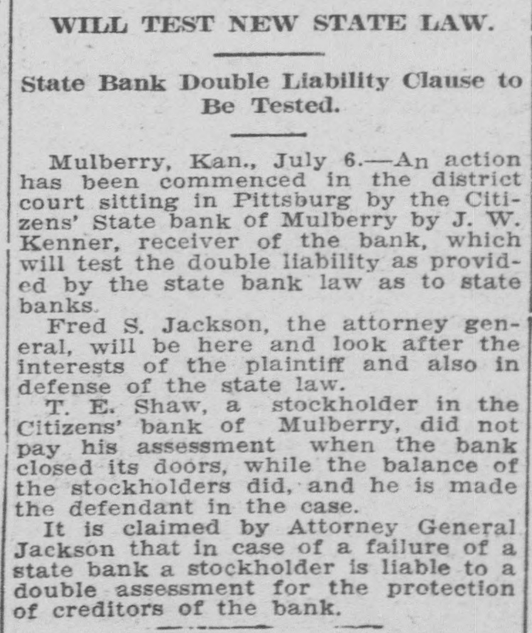 WILL TEST NEW STATE LAW. State Bank Double Liability Clause to Be Tested. Mulberry, Kan., July 6.-An action has been commenced in the district court sitting in Pittsburg by the Citizens' State bank of Mulberry by J. W. Kenner, receiver of the bank, which will test the double liability as provided by the state bank law as to state banks. Fred S. Jackson, the attorney general, will be here and look after the interests of the plaintiff and also in defense of the state law. T. E. Shaw, a stockholder in the Citizens' bank of Mulberry, did not pay his assessment when the bank closed its doors, while the balance of the stockholders did, and he is made the defendant in the case. It is claimed by Attorney General Jackson that in case of a failure of a state bank a stockholder is liable to a double assessment for the protection of creditors of the bank.