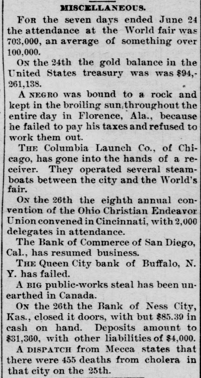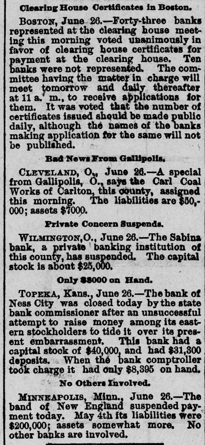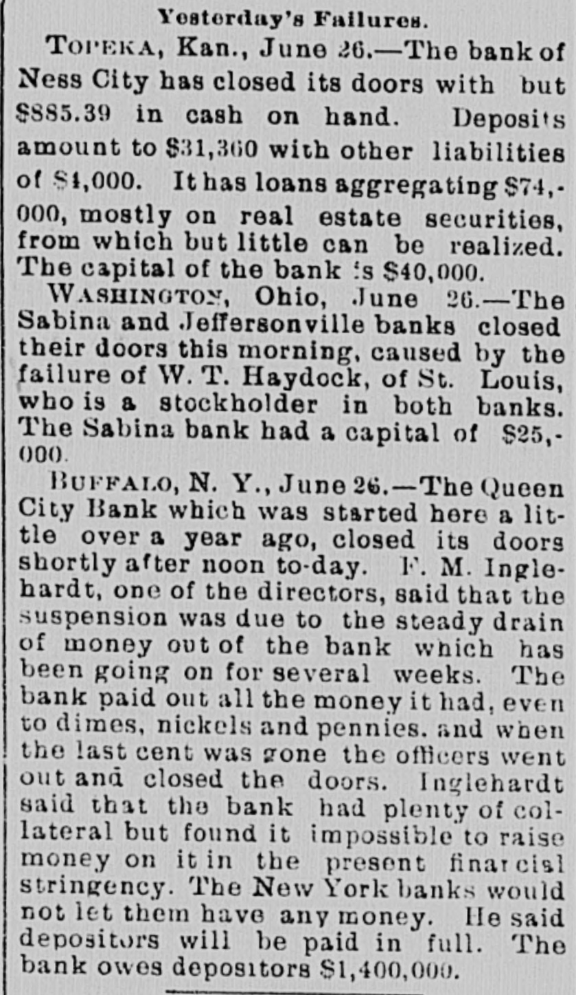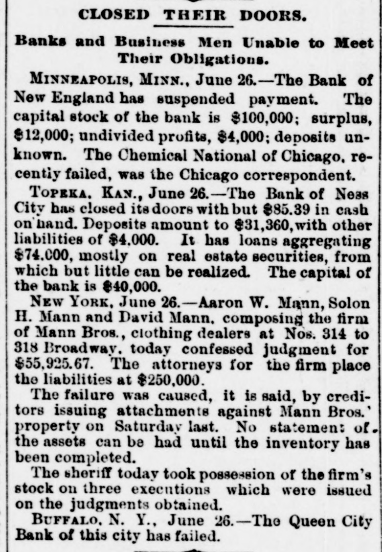FAILURES. MINNEAPOLIS, Minn., June 26.-The Bank of New England suspended payment Since this morning, temporarily at least. the failure of the State bank on Thursday dethere has been a steady withdrawal of posits. A. J. Blethen, the president of the bank, says that it had considerable money tied up by the Chicago failures. Every depositor, be adds, will be paid in full, of the as the stockholders i suffer instead if the bank does had cash available to the last depositors The bank not of resume. amount the $64,000 on May 4, the time and of but its liabilities were $200,000 that report, somewhat in excess of The capital stock of the is surplus, the amount. $100,000; assets $12,000; undivided bank profits, $4,000; deposits unknown. NESS CITY, Kan., June 26,-The Bank of ComNess City has been closed by Bank missioner Breidenthal, after an unsuccess- its ful attempt to raise money among its eastern stockholders to tide it over bank, present embarrassment. This had $31,300 which had a capital of $40,000, in deposits. When the bank commissioner took charge of it the cash on hand amountd to just $83.55. Mr. Breidenthal says real that the bank was loaded down with estate and bad debts. BUFFALO, N. Y. June 26.-The Queen The City bank of this city has failed. suspension is due to a drain of money bank out the bank for several weeks. The offiof owes depositors over $1,400,000. The will cers are hopeful that the bank reThe liabilities of the bank. accord- The sume. ing to the June report, are $2,323,754. assets are not known. The bank paid out all the money it had, Mr. to dimes, nickels and pennies. even Englehart, one of the directors, said that but the bank had plenty of collateral, found it impossible to realize on it in New the present financial stringency. The York banks would not let them have any The depositors will be paid In money. The state superintendent of banking an examiner here. until when he full. dent, will send recently, resigned The presi- on H. account of ill health, was William Jackson. Since his resignation the bank has been in charge of a committee of its directors. ALBANY, N. Y., June 26.-SuperintendPreston of the state banking department, ent speaking of the Queen City bank failure, said that the report of the condi- re-tion of the bank on June 1st showed sources of $2,351,600 and liabilities of $2,Reference to the amount of cash 351,600. on hand shows that it does not equal the amount of the 10 per cent legal reserve required by law. The report of the examiner for Feburary showed a nominal sur- had plus of $35,600. Poor investments considerable to do with the collapse. CHESTER, Pa., June 26. - The Crum Creek Iron and Steel company has assigned. The liabilities are estimated at $120,000 and the assets at $119,000. The sum of $40,000.is due the company from a former agent. Dullness in trade and threatened suits caused the failure. NEW YORK, June 26.Mann Bros., clothing dealers, today confessed judgment for $55,000. The attorneys for the say that the liabilities are about $300,000, half of which istor borrowed money and the other half for merchandise, The value of the assets is not known. The failure is attributed to several causes, the stringency in the money market being the principal one, as they were unable to meet notes as they mature. NEW YORK, June 26.-The supreme court this morning appointed a receiver for the Mutual Brewing company of College Point. GALLIPOLIS, O., June 26.-The Carl coal works, at Carlton, have assigned. The liabilities are $50,000, and the assets £7,000. HAMILTON, O., June 26.-Louis Snyder's Sons tonight assigned their four great paper mills at Hamilton, and their real estate and paper warehouses, with contents, in Cincinnati. The assets are over $1,000,000. The liabilities are less than $300,000. The assignment is due to the fact that they were unable to borrow $7, 000 from the banks. It is an old and well established firm. PORT ANGIERS, Wash., June 26.-The First National bank has suspended temporarily. The assets are $142,000, and the liabilities $85,000. SAN FRANCISCO, June 26.-Sands & Gump. extensive dealers in rt goods, have assigned. The liabilities are $14,000 and in the assets $100,000. The stringency money caused the failure. WILMINGTON, O., June -The Sabina bank, a private banking institution in this is county, has suspended. The capital $12,000. No statement was made. BOSTON, June xi-Forty-three banks, represented at the clearing house meeting this morning, voted unanimously in favor of clearing house certificates for payment at the clearing house.