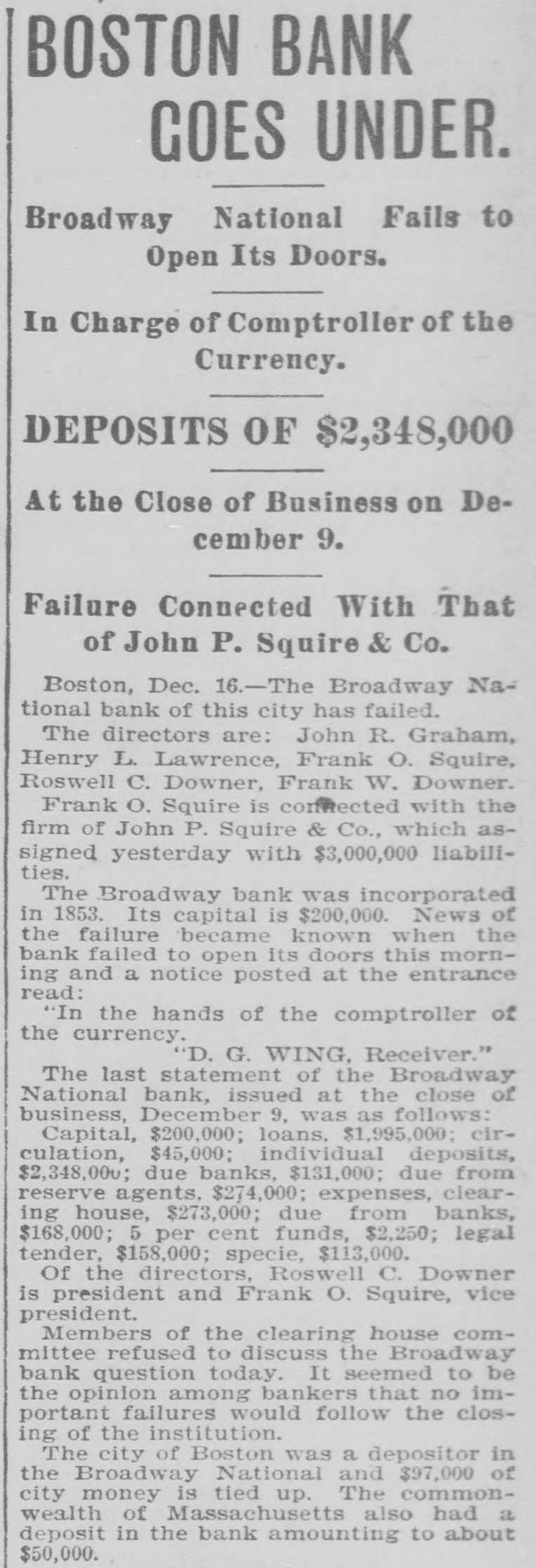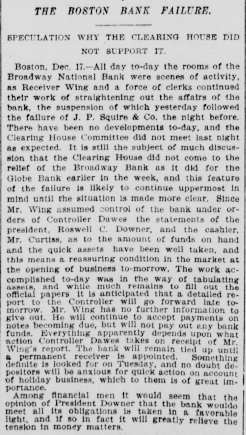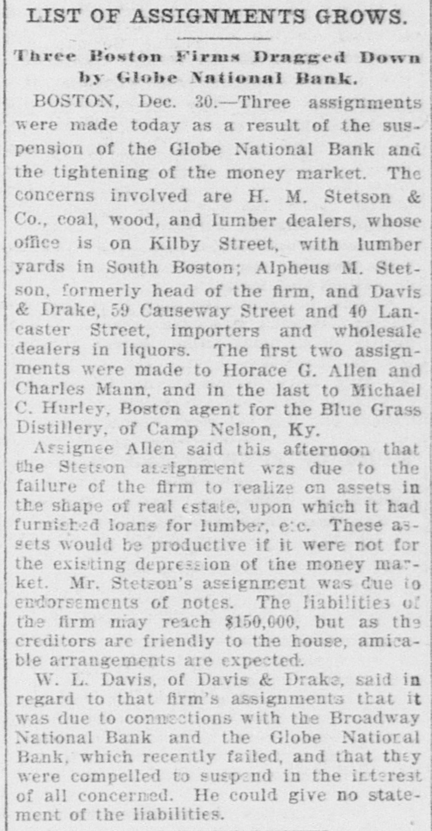 Produce Exchange Co. of New York Suspends Payment. Its Property and Affairs Placed in the Hands of a Special Committee. Allen & Co. Suspend. New York, Dec. 18.-The Produce Exwell, Charles A. Deshon, Edwin Gould, H. I. Irving Keyser, Edward R. Ladew, change Trust company, with offices in Henry A. McGee, W. Willis Merrill, J. the Standard Oil building, ait 29 BroadW. Middendorf, Edward A. Maher, S. way, has closed its doors. A notice upD Scudder, John A. Shibley, John P. on the door says that the company has Truesdell, C. M. Warner, John Skelton suspended payment pending an examiWilliams, B. F. Young, Thomas A. Mcnation of its books. Intyre. A statement of its condition was isThe officers of the company declined sued to day, giving its liabilities as $11,to see anybody or to give anything for 649,600 and its assets as $11,719,500. The publication beyond this supplementary statement says the assets are ample to statement that was posted on the meet all liabilities. doors: The liabilities are made up as fol"The immediate cause of the suspenlows: Capital and surplus $5,000,200; sion of the company is its inability to convert its securities into cash in time individual deposits, $2,928,000; trust funds, $21,600; due to banks, $3,700,000. to meet the sudden and abnormal deThe assets are scheduled as follows: mand made upon it." Cash on hand, $118,000; cash in Western ALLEN & CO. SUSPEND. National bank, $533,000; cash in National City bank, $100,000; cash in First NaNew York, Dec. 18.-The suspension tional bank of Jersey City, $125,000; of the firm of Henry Allen & Co., bankcash in Standard bank, $269,000; New ers and brokers, was announced on the York city bonds, $2,500,000; other bonds, Stock exchange today. $850,000; demand loans, $685,000; bills The firm is not yet prepared to make receivable, $847,000; due from banks, a statement, but the suspension is at$910,000; syndicate loans, $4,423,500; time tributed to the failure of some of its loans, $359,000. customers to respond to calls for addiThe notice posted on the door of the tional margins made necessary by recompany's office reads: cent declines. The house has been known as a trad"The board of directors of the Proer on an extensive scale. duce Exchange Trust Company has deemed it to be to the best interests of SITUATION AT BOSTON. its depositors and stockholders to susBoston, Dec. 18.-Business in banking pend payment spending the readjustcircles in this city was opened today ment of its affairs. The following special committee Edwin Gould, C.,P. with an apparent confidence that the troubles which were experienced last Armstrong, George R. Bidwell, Edward A. Maher and Frank Brainard has week, when two national banks in the city were embarrassed, one of which been appointed by the board of directclosed its doors, while the other acors to take charge of the property and cepted a loan of $3,500,000, were ended affairs of the company and are in posIf a trace of nervousness still remained (Sgd.) session thereof. it soon gave way to the improved con"ALMON GOODWIN, ditions resulting from conferences held "W.L.CROMWELL and plans laid by bankers during Sat"Counsel for committee." urday afternoon and Sunday. The Produce Exchange Trust ComThe Boston clearing house associapany was organized a couple of years tion issued a statement this morning ago with a capital of $2,500,000 and had to the effect that up to the present time a reported surplus and undivided profthe Globe National and the Broadway its at this time of over $2,500,000. Dts National Banks were the only two that business was chiefly with merchants, appealed to the association for assist tradesmen and corporations in its imance and that in all probability the af mediate vicinity, and it was also supfairs of the Broadway National Bank posed to do some of the banking busiwould be wound up in due course. The ness of the Standard Oil Company. It clearing house association voted today had been designated by the banking deto vest authority in its regular compartment of the state as a legal demittee to issue certificates at its dispository for state moneys as well as for cretion. In case a financial institution the funds of savings banks and state should need assistance the committee banks. The officers of the company are: will be enabled to act without calling President, Turner A., Beall; secretarya meeting of the association. treasurer, S. H. Chamberlain: assistIt seemed to be the general opinion ant secretary-treasurer, William M. that the crisis has been passed, and Law. that if there are no further heavy busiTrustees, Charles P. Armstrong, F. ness failures, the situation. will soon be normal. Brainard, Turner A. Beall, George Bid-