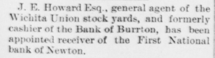 J. E. Howard Esq., general agent of the Wichita Union stock yards, and formerly cashier of the Bank of Burrton, has been appointed receiver of the First National bank of Newton.