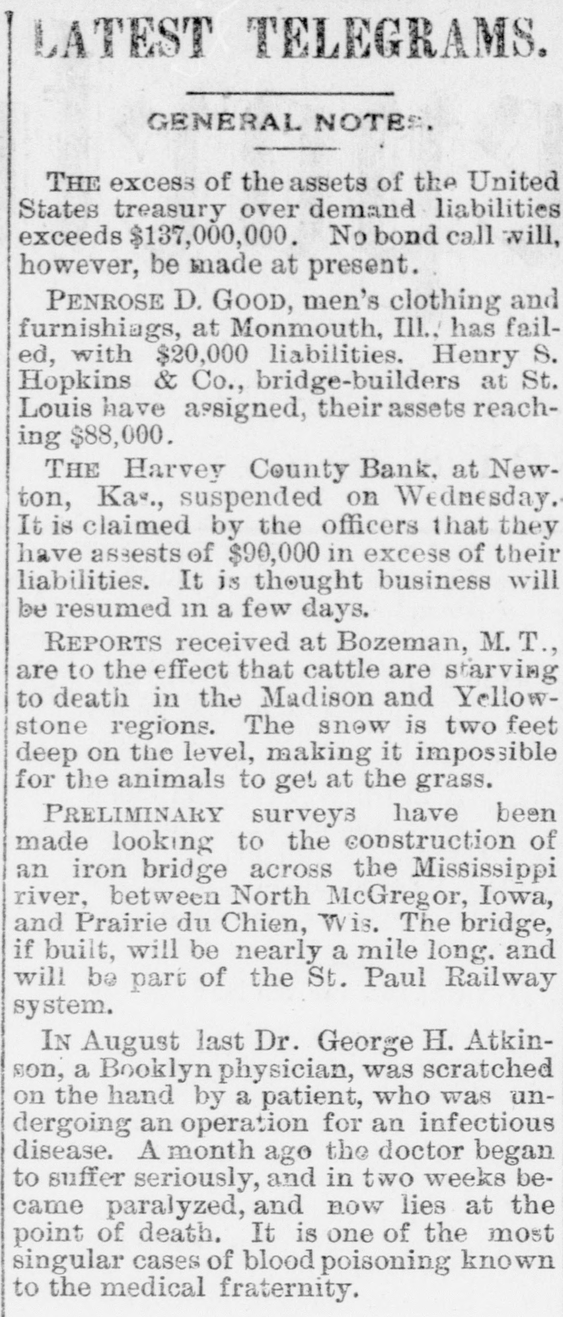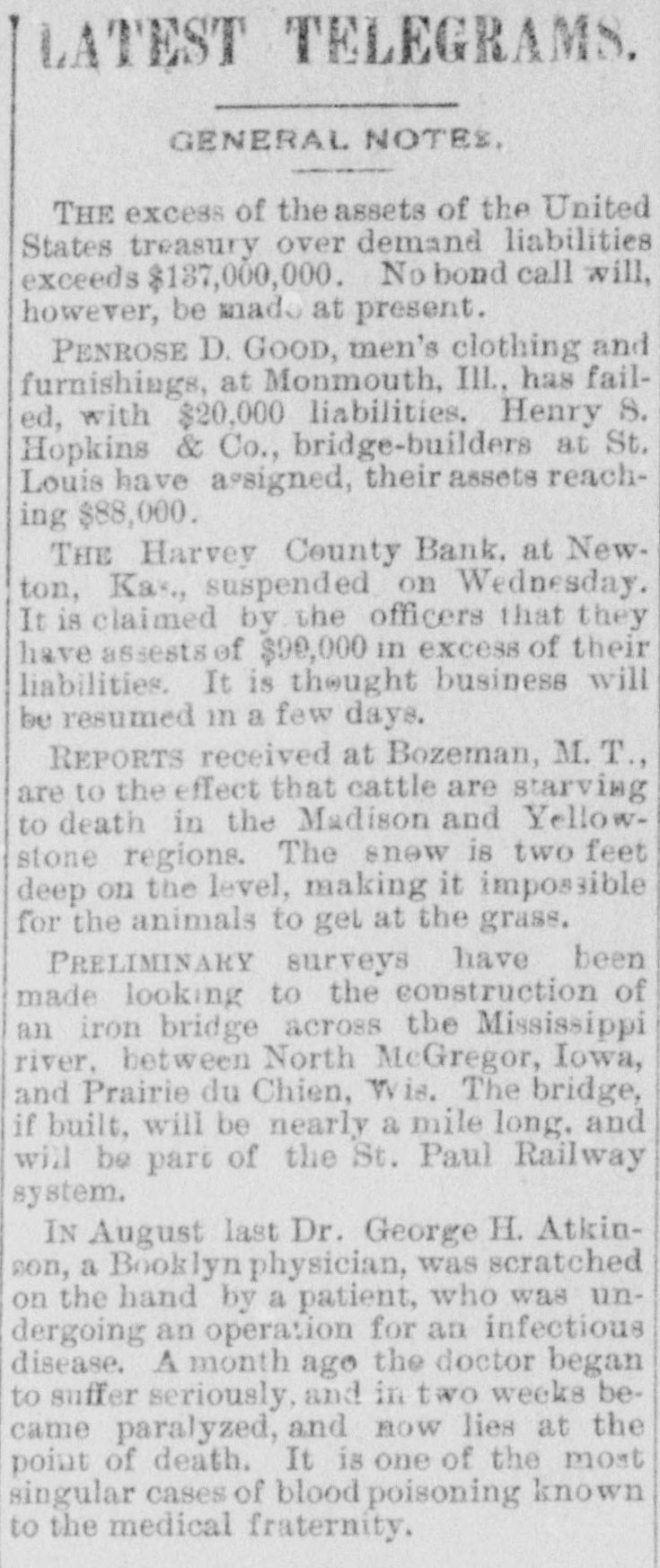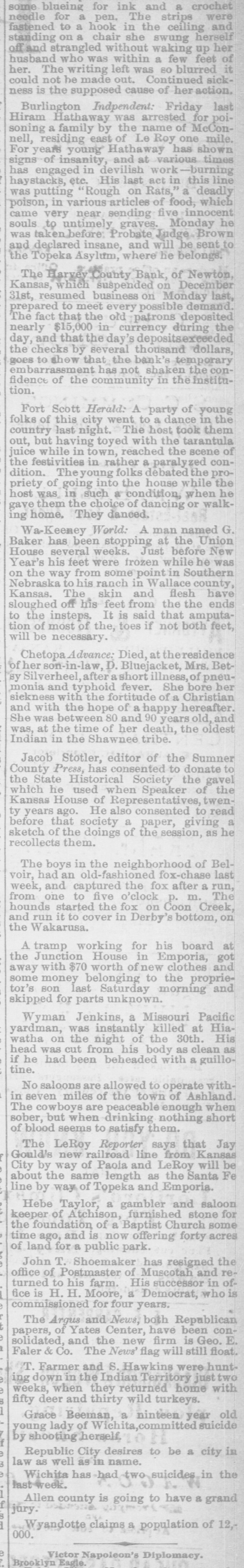 some blueing for ink and a crochet needle for a pen. The strips were fastened to a hook in the ceiling and standing on a chair she swung herself offand strangled without waking up her husband who was within a few feet of her. The writing left was 80 blurred it could not he made out. Continued sickness is the supposed cause of her action. Burlington Indpendent: Friday last Hiram Hathaway was arrested for poisoning a family by the name of McConnell, residing east of Le Roy one mile. For years young Hathaway has shown signs of insanity, and at various times has engaged in devilish work -burning haystacks, etc. His last act in this line was putting "Rough on Rats," a deadly poison, in various articles of food, which came very near sending five innocent souls to untimely graves. Monday he was taken.before: Probate Judge Brown and declared insane, and will be sent to the Topeka Asylum, where he belongs. The Harvey County Bank, of Newton, Kansas, which suspended on December 31st, resumed business on Monday last, prepared to meet every possible demand. The fact that the old patrons deposited nearly $15,000 in currency during the day, and that the day depositsexceeded the checks by several thousand dollars, goes to show that the bank's temporary embarrassment has not shaken the confidence of the community in the institution. Fort Scott Herald: party of young folks of this city went to a dance in the country last night. The host took them out, but having toyed with the tarantula juice while in town, reached the scene of the festivities in rather a paraly condition. The young folks debated the propriety of going into the house while the host was in such a condition, when he gave them the choice of dancing or walking home. They danced. Wa-Keeney World: A man named G. Baker has been stopping at the Union House several weeks. Just before New Year's his feet were frozen while he was on the way from some point in Southern Nebraska to his ranch in Wallace county, Kansas. The skin and flesh have sloughed off his feet from the the ends to the insteps. It is said that amputation of most of the, toes if not both feet, will be necessary. Chetopa Advance: Died, at theresidence of her son-in-law, D. Bluejacket, Mrs. Betsy Silverheel, after ashort illness, of pneumonia and typhoid fever. She bore her siekness with the fortitude of a Christian and with the hope of a happy hereafter. She was between 80 and 90 years old, and was, at the time of her death, the oldest Indian in the Shawnee tribe. Jacob Stotler, editor of the Sumner County Press, has consented to donate to the State Historical Society the gavel which he used when Speaker of the Kansas House of Representatives, twenty years ago. He also consented to read before that society a paper, giving a sketch of the doings of the session, as he recollects them. The boys in the neighborhood of Belvoir, had an old-fashioned fox-chase last week, and captured the fox after a run, from one to five o'clock p. m. The hounds started the fox on Coon Creek, and run it to cover in Derby's bottom, on the Wakarusa. A tramp working for his board at the Junction House in Emporia, got away with $70 worth of new clothes and some money belonging to the proprietor's son last Saturday morning and skipped for parts unknown. Wyman Jenkins, a Missouri Pacific yardman, was instantly killed at Hiawatha on the night of the 30th. His head was cut from his body as clean as if he had been beheaded with a guillotine. No saloons are allowed to operate within seven miles of the town of Ashland. The cowboys are peaceable enough when sober, but when drinking nothing short of blood seems to satisfy them. The LeRoy Reporter says that Jay Gould's new railroad line from Kansas City by way of Paoia and LeRoy will be about the same length as the Santa Fe line by way of Topeka and Emporia. Hebe Taylor, a gambler and saloon keeper of Atchison, furnished stone for the foundation of a Baptist Church some time ago, and is now offering forty acres of land for a public park. John T. Shoemaker has resigned the office of Postmaster of Muscotah and returned to his farm. His successor in office is H. H. Moore, a Democrat, who is commissioned for four years. The Argus and News, both Republican papers, of Yates Center, have been consolidated, and the new firm is Geo. E. Faler & Co. The News' flag will still float. T. Farmer and S. Hawkins were hunting down in the Indian Territory just two weeks, when they returned home with fifty deer and thirty wild turkeys. Grace Beeman, a ninteen year old young lady of committed suicide by shooting herself. Republic City desires to be a city in law as well as in name. Wichita has had two suicides in the last week. Allen county is going to have a grand jury. Wyandotte claims & population of 12,000. Victor Napoleon's Diplomacy. Brooklyn Eagle.