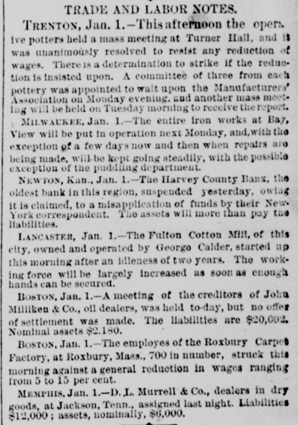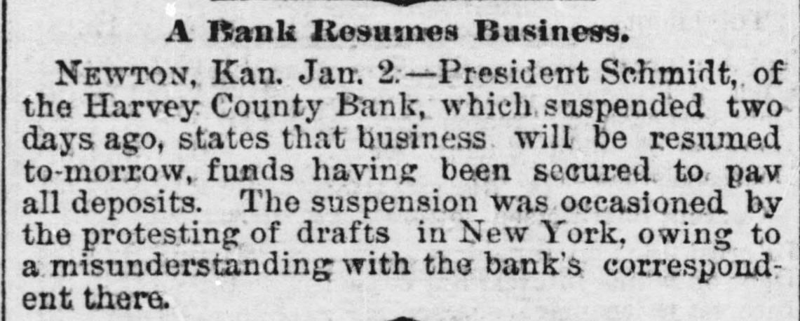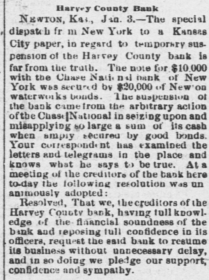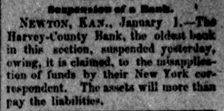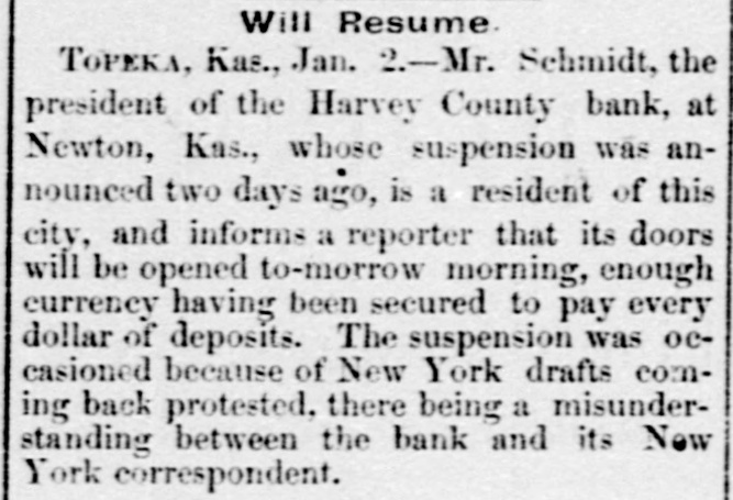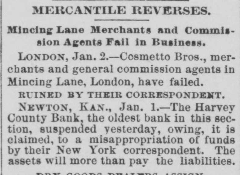 some blueing for ink and a crochet needle for a pen. The strips were fastened to a hook in the ceiling and standing on a chair she swung herself offand strangled without waking up her husband who was within a few feet of her. The writing left was 80 blurred it could not he made out. Continued sickness is the supposed cause of her action. Burlington Indpendent: Friday last Hiram Hathaway was arrested for poisoning a family by the name of McConnell, residing east of Le Roy one mile. For years young Hathaway has shown signs of insanity, and at various times has engaged in devilish work -burning haystacks, etc. His last act in this line was putting "Rough on Rats," a deadly poison, in various articles of food, which came very near sending five innocent souls to untimely graves. Monday he was taken.before: Probate Judge Brown and declared insane, and will be sent to the Topeka Asylum, where he belongs. The Harvey County Bank, of Newton, Kansas, which suspended on December 31st, resumed business on Monday last, prepared to meet every possible demand. The fact that the old patrons deposited nearly $15,000 in currency during the day, and that the day depositsexceeded the checks by several thousand dollars, goes to show that the bank's temporary embarrassment has not shaken the confidence of the community in the institution. Fort Scott Herald: party of young folks of this city went to a dance in the country last night. The host took them out, but having toyed with the tarantula juice while in town, reached the scene of the festivities in rather a paraly condition. The young folks debated the propriety of going into the house while the host was in such a condition, when he gave them the choice of dancing or walking home. They danced. Wa-Keeney World: A man named G. Baker has been stopping at the Union House several weeks. Just before New Year's his feet were frozen while he was on the way from some point in Southern Nebraska to his ranch in Wallace county, Kansas. The skin and flesh have sloughed off his feet from the the ends to the insteps. It is said that amputation of most of the, toes if not both feet, will be necessary. Chetopa Advance: Died, at theresidence of her son-in-law, D. Bluejacket, Mrs. Betsy Silverheel, after ashort illness, of pneumonia and typhoid fever. She bore her siekness with the fortitude of a Christian and with the hope of a happy hereafter. She was between 80 and 90 years old, and was, at the time of her death, the oldest Indian in the Shawnee tribe. Jacob Stotler, editor of the Sumner County Press, has consented to donate to the State Historical Society the gavel which he used when Speaker of the Kansas House of Representatives, twenty years ago. He also consented to read before that society a paper, giving a sketch of the doings of the session, as he recollects them. The boys in the neighborhood of Belvoir, had an old-fashioned fox-chase last week, and captured the fox after a run, from one to five o'clock p. m. The hounds started the fox on Coon Creek, and run it to cover in Derby's bottom, on the Wakarusa. A tramp working for his board at the Junction House in Emporia, got away with $70 worth of new clothes and some money belonging to the proprietor's son last Saturday morning and skipped for parts unknown. Wyman Jenkins, a Missouri Pacific yardman, was instantly killed at Hiawatha on the night of the 30th. His head was cut from his body as clean as if he had been beheaded with a guillotine. No saloons are allowed to operate within seven miles of the town of Ashland. The cowboys are peaceable enough when sober, but when drinking nothing short of blood seems to satisfy them. The LeRoy Reporter says that Jay Gould's new railroad line from Kansas City by way of Paoia and LeRoy will be about the same length as the Santa Fe line by way of Topeka and Emporia. Hebe Taylor, a gambler and saloon keeper of Atchison, furnished stone for the foundation of a Baptist Church some time ago, and is now offering forty acres of land for a public park. John T. Shoemaker has resigned the office of Postmaster of Muscotah and returned to his farm. His successor in office is H. H. Moore, a Democrat, who is commissioned for four years. The Argus and News, both Republican papers, of Yates Center, have been consolidated, and the new firm is Geo. E. Faler & Co. The News' flag will still float. T. Farmer and S. Hawkins were hunting down in the Indian Territory just two weeks, when they returned home with fifty deer and thirty wild turkeys. Grace Beeman, a ninteen year old young lady of committed suicide by shooting herself. Republic City desires to be a city in law as well as in name. Wichita has had two suicides in the last week. Allen county is going to have a grand jury. Wyandotte claims & population of 12,000. Victor Napoleon's Diplomacy. Brooklyn Eagle.