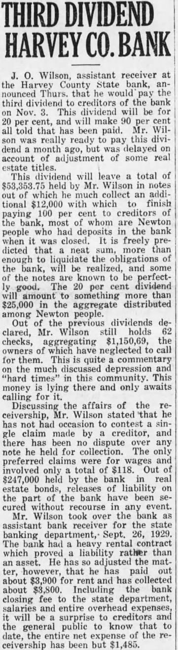 Wilson, assistant receiver at the Harvey County State bank, nounced Thurs. that he would third dividend creditors of the bank Nov. This dividend will for and make 90 per all told that has been paid. Mr. really ready this divison was pay dend month ago, but account of adjustment of some real estate titles. This leave total of held Mr. in notes which much collect an addiwith which finish 100 cent creditors paying per bank, most whom are Newton people deposits in the bank when closed. freely dicted that neat sum, more than enough liquidate the obligations bank, will realized, and some the notes are known perfectcent dividend amount something more than the aggregate distributed among Newton people. Out the previous dividends clared, Mr. Wilson holds checks, aggregating $1,150,69, the owners which have neglected to them. This quite commentary the much discussed depression times" this community. This money lying there and only awaits calling for Discussing the affairs of the ceivership, Wilson stated that has occasion to contest claim made by creditor, and there has been dispute note he held for collection. The only preferred claims were wages and involved total Out held by the bank real estate bonds, releases of liability on the the bank have been without recourse event. Mr. Wilson took over the bank assistant bank receiver for the state banking department, Sept. 26, 1929. The had heavy rental contract which proved liability rather than He adjusted the mathowever, that he paid about for rent has collected about $3,800. Including bank closing fee the state department, salaries entire will be surprise to creditors and public to know that date, entire expense the ceivership has been but