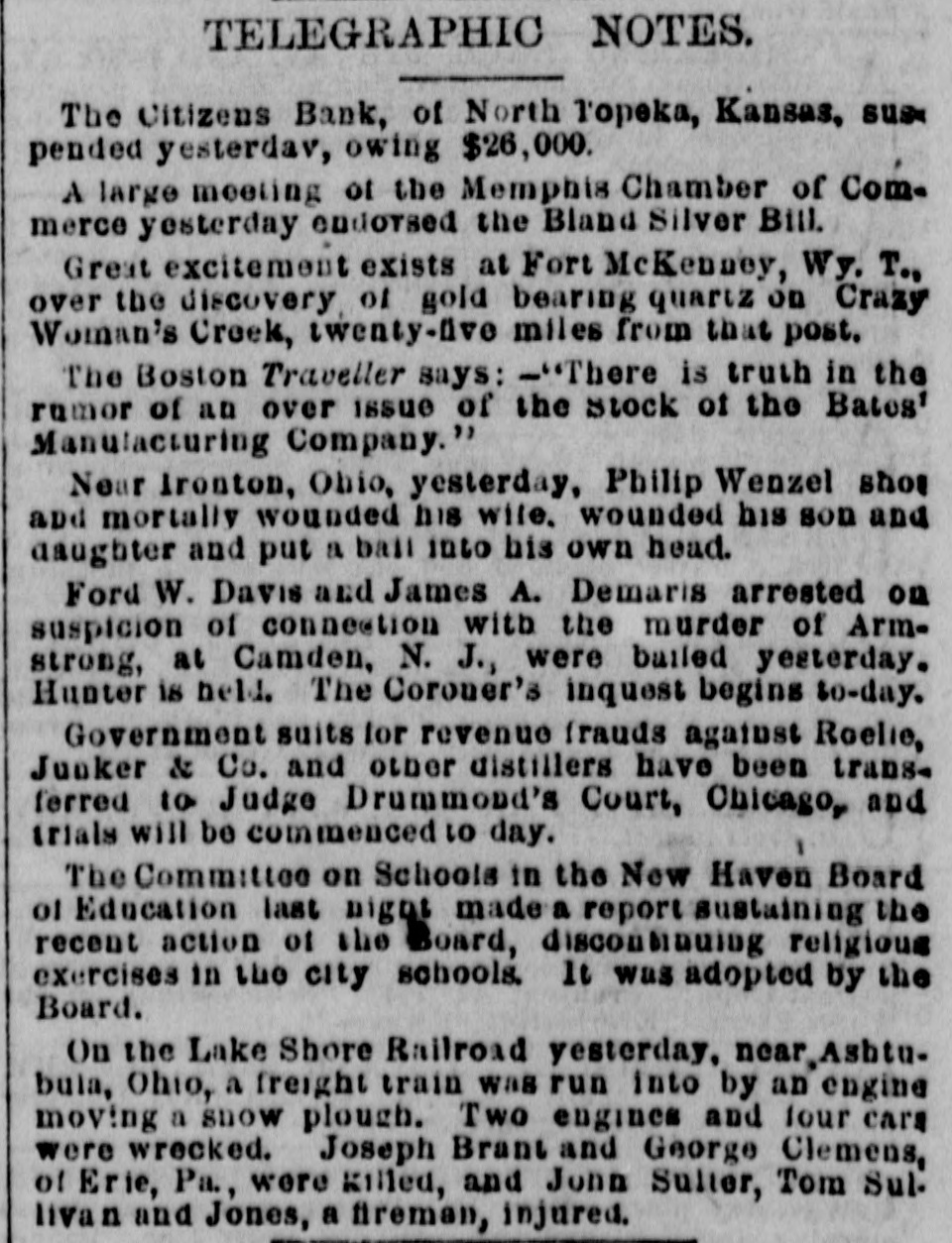 TELEGRAPHIC TICKS. Russian troops are continually arriving at Jassy. There is no change to note in price of Chicago whisky. There is a steady demand for wool in the Philadelphia market. The Citizens' bank of North Topeka, Kansas, has closed for repairs. There was a heavy run on the savings bank at Port Jervis, N. Y., yesterday. The Merchants' National bank of Fort Scott, Kansas, closed its doors yesterday. A fire at Napiersville, Quebec, on Friday, burned Landrie's steam mill; no insurance. Joseph Woods, for the murder of Stephen Woods, was hung at Malone, N. Y., yesterday. The cases of the Chicago whisky crooks will come up for" trial to-day before Judge Drummond. The Providence County savings bank, at Pawtucket, R. I., is enjoined from doing further business. The burning of ten wooden buildings at Glover's Corners, Mass., on Friday, caused a loss of $30,000. The wife of a Canadian laborer at St. Benoit has given birth to twins united like the Siamese twins. Hobart Pasha's fleet has arrived at Constantinople from Batoum, bringing a large part of the garrison. Bursiness was entirely suspended in Boston, Thursday, by a snow storm, which was the most severe in ten years. The brig Chattanooga went ashore, Thursday, off the coast of Maryland, and the captain, second mate and a seaman were drowned. A negro named Philip Watson, who murdered his wife with a hatchet, last September. at Covington, Ky., was hanged. Friday, in presence of 5,000 spectators. e The manufactory of T. M. Holmes, at Charlestown, Mass., was destroyed by fire on Friday; loss $230,000. Adjacent buildings were damaged to the extent of $20,000. Wm. Weiners, who shot and killed A. V. Laurence, a barkeeper in the Theatre Comique, St. Louis, over a year ago, was hung in the jail yard of that city Friday morning. The rear end of a freight train bound east on the Lake Shore & Michigan Southern railroad, was run into by a snow plow propelled by two engines, near Ashtabula, Ohio, Friday. Both engines and four cars were wrecked. Joseph Brant and Geo. Clemens were killed, and John Sutter, Tim Sullivan and a fireman named Jones, were badly injured.