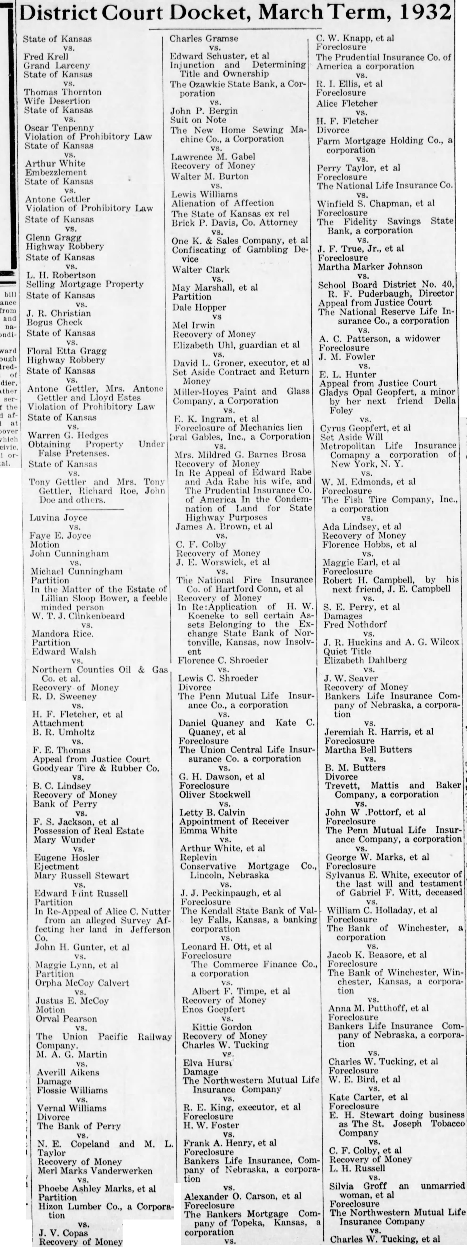 Edward Schuster, et al Injunction and Determining Title and Ownership The Ozawkie State Bank, a Corporation vs. John P. Bergin Suit on Note The New Home Sewing Machine Co., a Corporation vs. Lawrence M. Gabel Recovery of Money Walter M. Burton vs. Lewis Williams Alienation of Affection The State of Kansas ex rel Brick P. Davis, Co. Attorney One K. & Sales Company, et al Confiscating of Gambling Device Walter Clark May Marshall, et al Partition Dale Hopper vs
