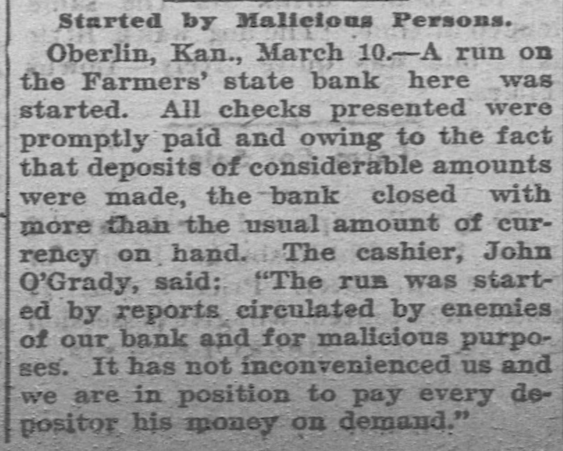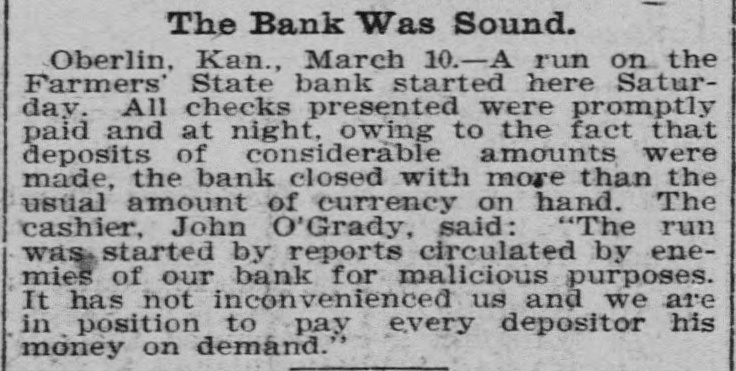 The Bank Was Sound. Oberlin, Kan., March 10.-A run on the Farmers' State bank started here Saturday. All checks presented were promptly paid and at night, owing to the fact that deposits of considerable amounts were made, the bank closed with more than the usual amount of currency on hand. The cashier, John O'Grady, said: "The run was started by reports circulated by enemies of our bank for malicious purposes. It has not inconvenienced us and we are in position to pay every depositor his money on demand.