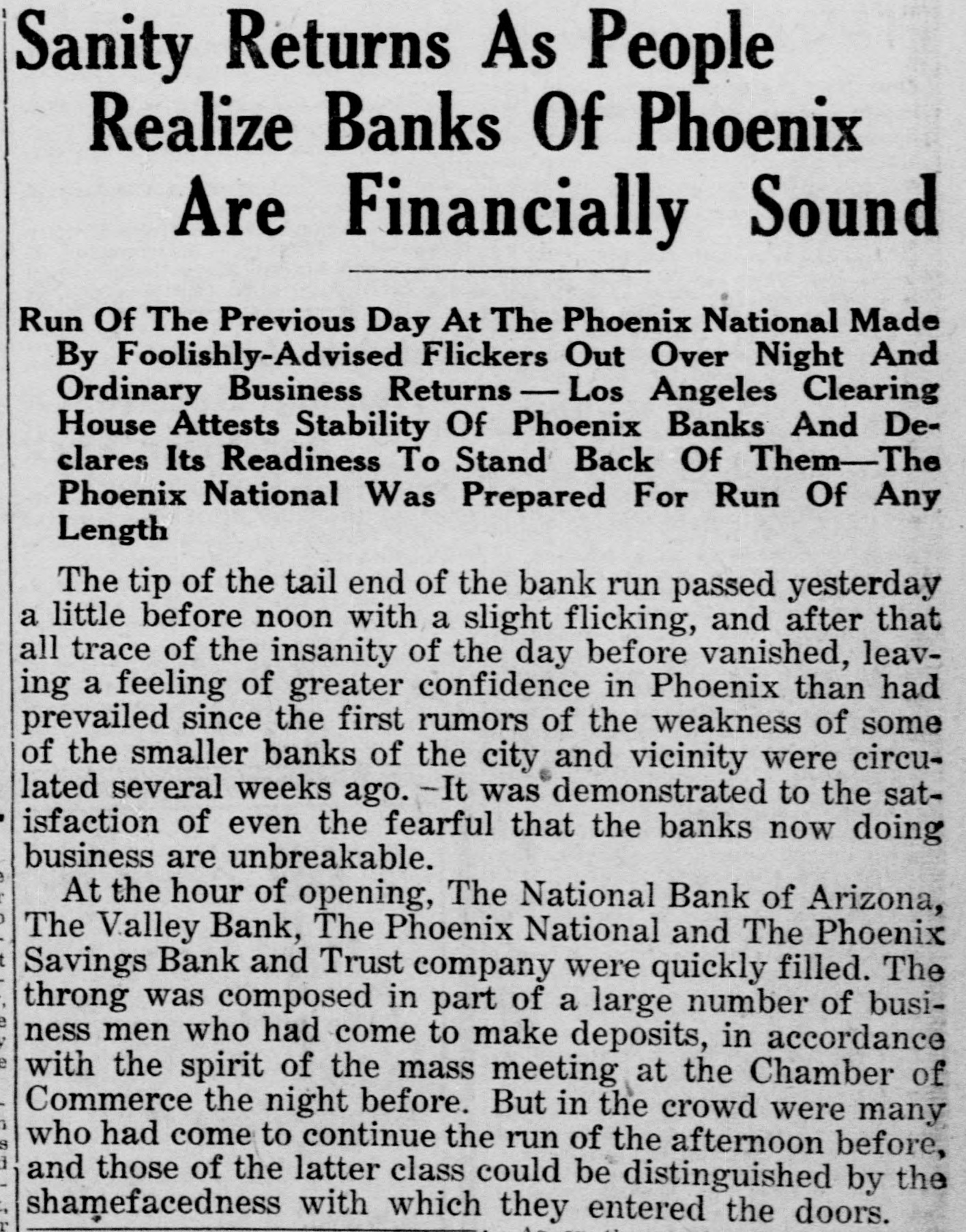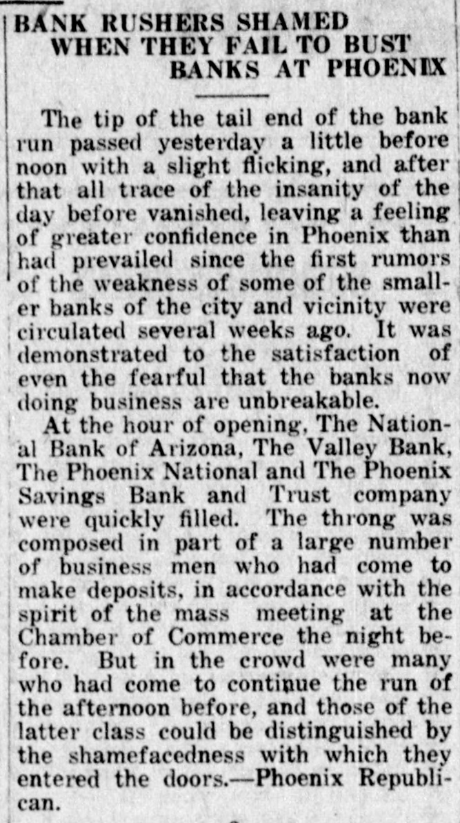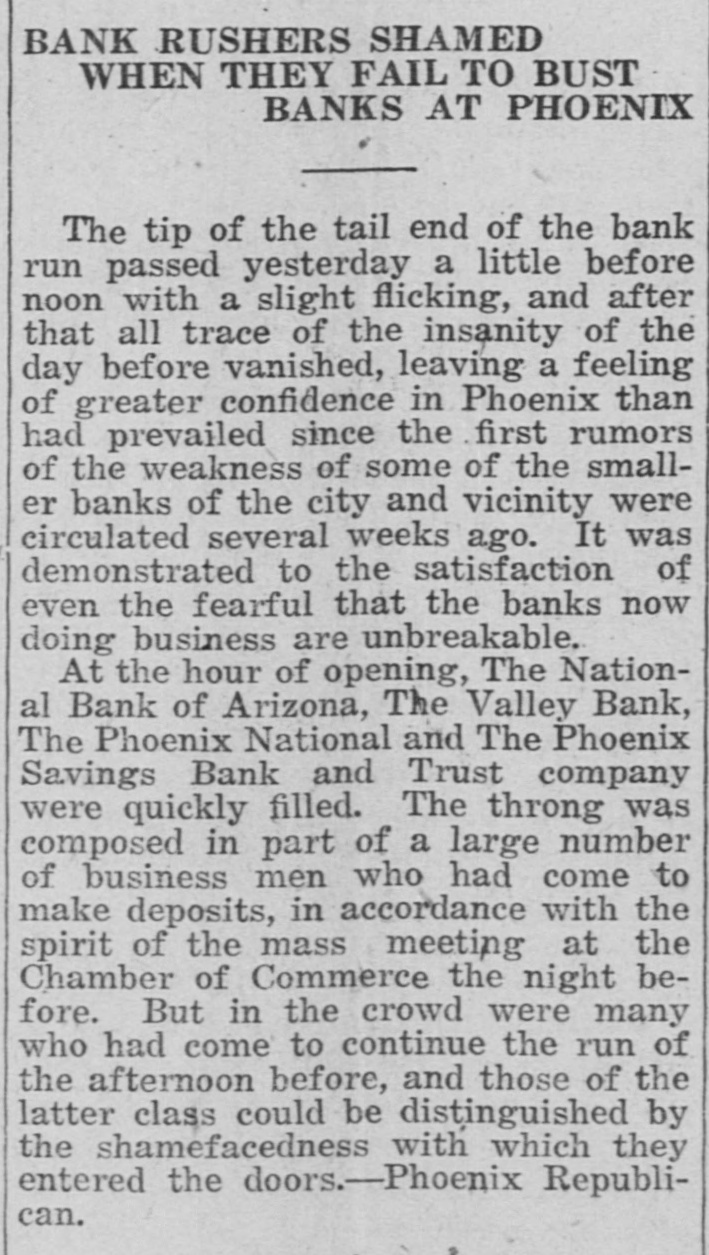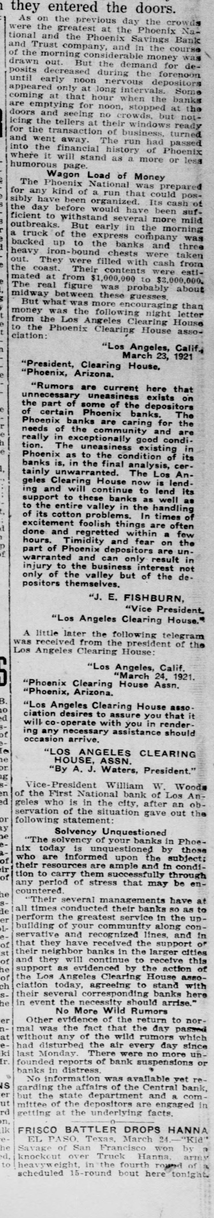 entered the day doors. the crowds they previous Phoenix NaAs on the greatest at the Savings Bank were the the Phoenix in the course was detional and the Trust and company, considerable.m and demand money for morning the forenoon of out. But the depositors early at long the drawn posits until decreased noon during nervous intervals. when banks Some only hour at the coming for noon, crowds, but ready are appeared emptying at that no windows stopped notand seeing their turned doors the tellers at of business. passed it icing transaction The run had Phoenix into and for the went the will financial away. stand history as a more of or less humorous where page. Load of Money Repared was Phoenix Wagon National that could cash pos- of for any been have been mild sibly The have kind before of would organized. a run several Its more sufthe day withstand the morning to But early company of the banks outbreaks. ficient express in and taken three was backed up hound cash the coast. from heavy a truck iron- to the filled chests with were were from estiout. They were Their contents to $3,000,000. mated at $1,000,00 was guesses. about than The real between figure these ncouraging letter to the midway But what was the more following Clearing night House ciation: from money the was Phoenix Los Angeles Clearing House Calif. asso"Los Angeles, 1921 March 23, Phoenix, Arizona. President, Clearing House, here that "Rumors are uneasiness current depositors exists on unnecessary of some of the banks. The the e the certain part Phoenix caring for are n The of Phoenix, banks community are good and condie needs really in of exceptionally the uneasincondition existing of its in 1, tion. Phoenix as to the the final analysis, Los cer- Anbanks unwarranted. in The now is lendtainly geles Clearing will continue House to as lend well its as and these banks the handling of often supportine to ing the to valley problems. in In are times of its cotton foolish things within a few the excitement and regretted and fear on undone hours. Phoenix Timidity depositors only result are in part of and business can interest the de- not warranted injury of to the the valley but of positors only themselves. "J. E. FISHBURN, "Vice President "Los Angeles Clearing telegram House. was received Clearing n A little later from the the following House: president of the I Los Angeles "Los Angeles, "March 24. Calif. 1921. B. "Phoenix, Arizona. o House "Phoenix Clearing House Assn. asso. d "Los Angeles Clearing to assure you in render- that it any arrive. a ciation will co. desires operate necessary with assistance you should e or ing occasion ANGELES CLEARING g W. William en "LOS "By HOUSE, A. J. ASSN. Waters, President." Woods Los Aned Vice-Presidentional bank of ob- the or y of geles the who First of is the in situation the city, after gave out an e following servation Solvency statement Liquestioned your banks by Phoe- those of ir "The solvency is unquestioned subject: condition of of period nix today are informed are successfully ample upon and in through enhe who their to resources em carry stress that may be at have to de er 1perform of your any countered. "Their conducted several managements their banks in so the as uptimes greatest munity service along con- in of st of and received the larger this servative building all the ecognized community the lines. support and cities OF he that they have banks in to receive action of the their neighbor will continue by the assoch of and they evidenced Clearing House with Ssupport as Angeles to stand here he ciation Los several today, necessity corresponding agreeing banks arrise." er nOther fact in their event No the More of Wild the Rumors return day to passed norat was of the every day ki Er. without There the were no mal disturbed evidence any the that air wild the rumors more which since un- or rehad last Monday. reports of bank vet is er founded in distress. was available Central bank, combanks No information affairs of the and a ut rd garding the state department engaged in n, mittee but the of the depositors underlying facts. 1k EL PASO. of San Savage d. Truck Hanna, getting FRISCO at BATTLER the Texas, March DROPS won HANNA by Kid arme in the to of fourth round bout here scheduled tonight