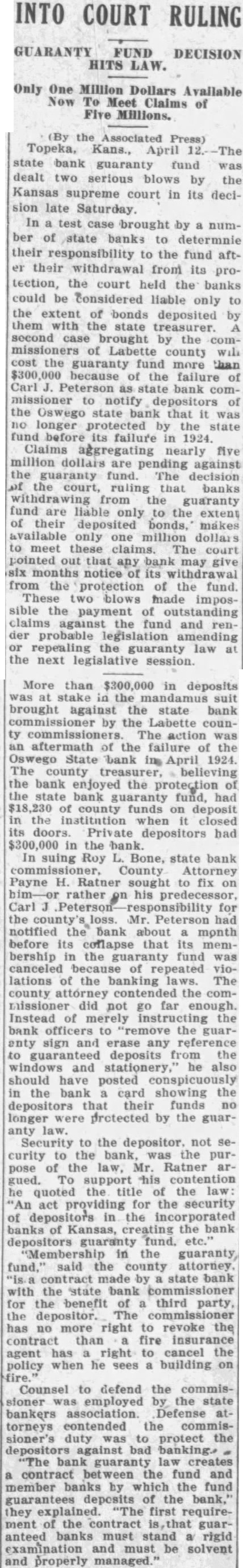 INTO COURT RULING GUARANTY FUND DECISION HITS Only One Million Dollars Available Now To Meet Claims of Five Millions. the Associated Press) Topeka, Kans., April state bank fund guaranty dealt two serious blows by the Kansas supreme court in its decision late In test case brought by ber of state banks to determnie their responsibility to the fund afttheir withdrawal from its protection, the court held the banks could be considered liable only the extent of bonds deposited them with the state second case brought by the Labette county cost the guaranty fund more than because failure Carl as state bank commissioner notify depositors the Oswego state bank that was longer protected by the state fund before its failure 1924. Claims aggregating nearly five million dollars are pending against guaranty fund. The decision court, ruling that banks from the guaranty fund are liable only to the extent of their deposited bonds. mákes available only one million dollars meet these claims. The court pointed out that bank may months notice its from the protection of the fund. These blows made impossible the payment claims against the fund and renprobable legislation amending repealing the guaranty law the next legislative session. More than $300,000 in deposits was stake the mandamus suit brought against the state bank the Labette counThe action aftermath the failure of the Oswego State bank April 1924. The county treasurer, believing the bank the protection the state bank guaranty fund. had county funds deposit in the institution closed doors. Private depositors had in the In suing Roy Bone, bank County Payne Ratner sought to fix rather his Carl for the Mr Peterson had notified bank about month before its collapse that its membership the fund canceled of repeated lations of the banking The county contended the missioner did far enough. Instead merely instructing the bank officers "remove the guarenty reference guaranteed deposits from the windows and stationery, he also should have posted the bank card showing the depositors that their funds longer protected by the Security to the depositor, not curity to the bank, was the pose the Mr. Ratner quoted the title the law act for the security in the banks of Kansas, the bank depositors guaranty fund. "Membership the guaranty, fund, said county attorney made by state bank the state bank benefit of third party, depositor The has no more right to revoke the contract than fire insurance has right to cancel the agent policy when he sees building Counsel to defend the commissioner was employed the state bankers association. torneys contended the commissioner's duty was to protect the against bad banking guaranty law contract the fund and member banks by which the fund of the bank,' they first ment the guaranteed banks must stand rigid and must be solvent and properly managed."