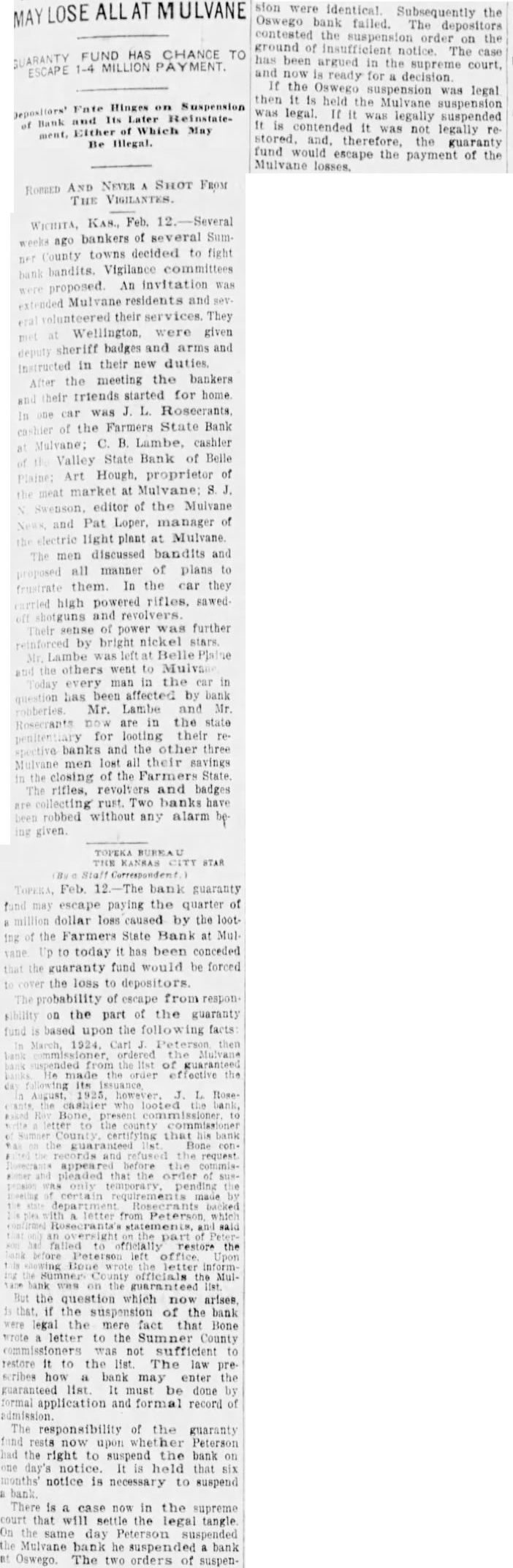 MAY LOSE ALLA MULVANE FUND HAS CHANCE TO GUARANTY ESCAPE 1-4 MILLION PAYMENT. Hinges on Suspension Depositors' and Its Later Reinstateof Bank Which May Be Illegal. AND NEVER SHOT THE VIGILANTES. Feb. ago bankers of several Sumtowns decided to fight Vigilance committees An invitation was proposed. extended Mulvane residents and their They were given badges and arms and instructed in their new duties the meeting the bankers triends started for home was J. the Farmers State Bank of C. B. Lambe, cashier Valley State Bank of Belle proprietor of Art meat market at Mulvane: S. J. editor of the Mulvane Pat manager of light plant at Mulvane The men discussed bandits and all manner of plans to them In the car they carried high powered rifles. sawed of power was further reinforced by bright nickel stars Lambe was at Belle and the others went to Mulvan every man in the car in question has been affected by bank Mr. Lambe and Mr. Resecrants DOW are in the state for looting their respective banks and the other three Mulvane men lost all their savings the closing of the Farmers State The rifles, revolvers and badges rust. Two banks have been without any alarm be TOPEKA BUREAU THE KANSAS CITY fund escape paying the quarter of dollar loss caused by the loot. Farmers State Bank at Mul to today has been conceded the guaranty fund would be forced the loss to depositors. probability of escape from respon sibility on the part of the guaranty based upon the facts of guaranteed order effective the following cashier looted to that records refused that order pending the backed from statements and officially restore the before Peterson left Bone letter officials Mulbank the guaranteed But the question which now arises that, if the suspension of the bank were legal the mere fact that Bone letter to the Sumner County was not sufficient to restore It to the list The law prescribes how bank may enter the guaranteed list It must be done by formal application and formal record of The responsibility of the guaranty fund rests now upon whether Peterson the right to suspend the bank on one day's notice. held that months' notice is necessary to suspend There is a case now in the supreme court that will settle the legal tangle the same day Peterson suspended Mulvane bank he suspended bank Oswego. The two orders of suspen- sion were identical Subsequently the Oswego bank failed. The depositors contested the suspension order on the ground of insufficient notice. The case has been argued in the supreme court. and now is ready for decision If the Oswego suspension was legal then It is held the Mulvane suspension was legal. If It WAS legally suspended It contended It was not legally restored. and, therefore, the guaranty fund would escape the payment of the Mulvane