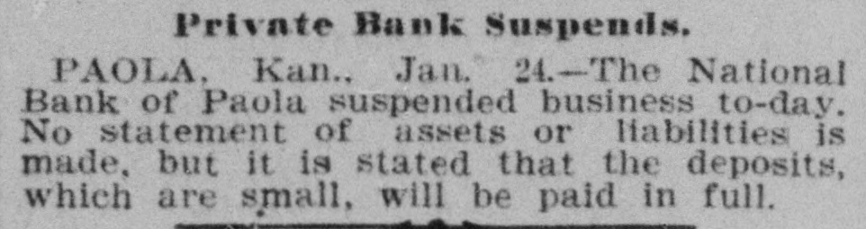 Private Bank Suspends. PAOLA, Kan.. Jan. 24.-The National Bank of Paola suspended business to-day. No statement of assets or liabilities is made, but it is stated that the deposits, which are small, will be paid in full.