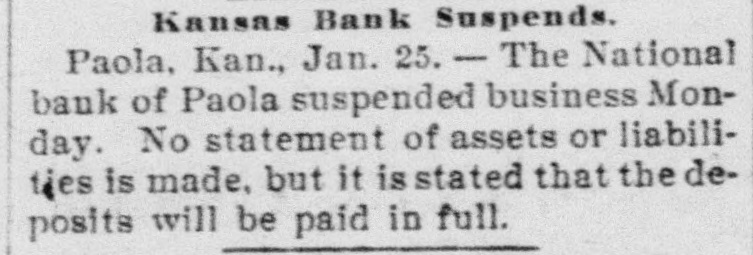 Kansas Bank Suspends. Paola, Kan., Jan. 25. - The National bank of Paola suspended business Monday. No statement of assets or liabilities is made, but it is stated that the deposits will be paid in full.