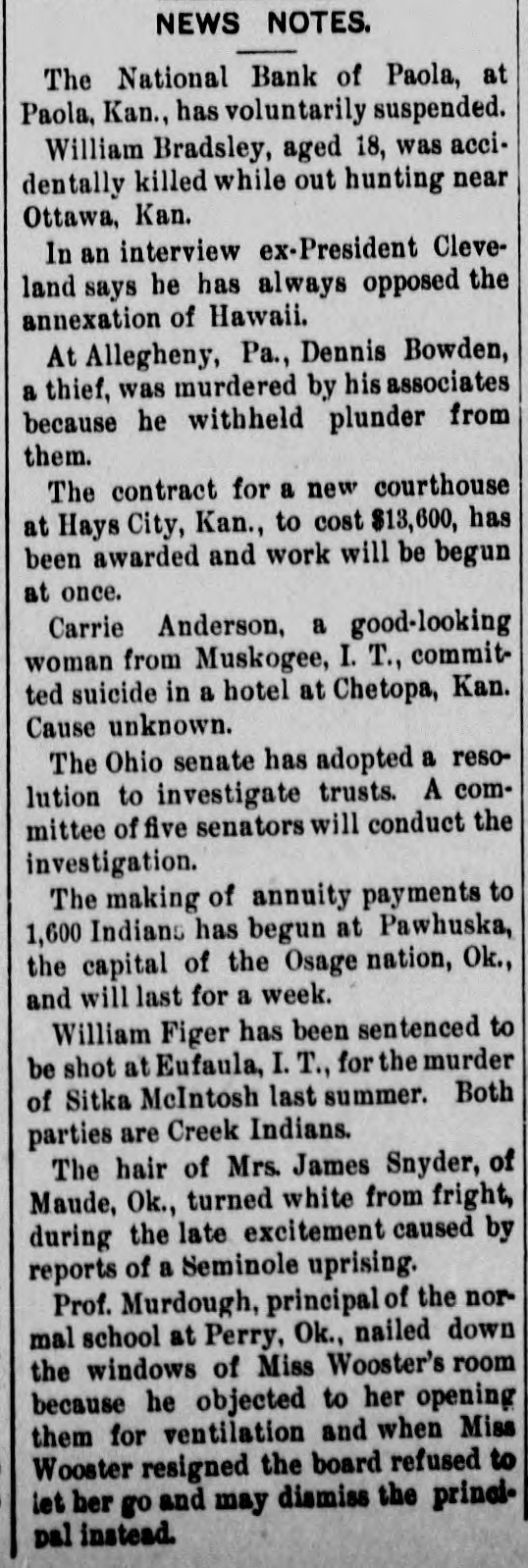 NEWS NOTES. The National Bank of Paola, at Paola, Kan., has voluntarily suspended. William Bradsley, aged 18, was accidentally killed while out hunting near Ottawa, Kan. In an interview ex-President Cleveland says he has always opposed the annexation of Hawaii. At Allegheny, Pa., Dennis Bowden, a thief, was murdered by his associates because he withheld plunder from them. The contract for a new courthouse at Hays City, Kan., to cost $13,600, has been awarded and work will be begun at once. Carrie Anderson, a good-looking woman from Muskogee, I. T., committed suicide in a hotel at Chetopa, Kan. Cause unknown. The Ohio senate has adopted a resolution to investigate trusts. A committee of five senators will conduct the investigation. The making of annuity payments to 1,600 Indians has begun at Pawhuska, the capital of the Osage nation, Ok., and will last for a week. William Figer has been sentenced to be shot at Eufaula, I. T., for the murder of Sitka McIntosh last summer. Both parties are Creek Indians. The hair of Mrs. James Snyder, of Maude, Ok., turned white from fright, during the late excitement caused by reports of a Seminole uprising. Prof. Murdough, principal of the normal school at Perry, Ok., nailed down the windows of Miss Wooster's room because he objected to her opening them for ventilation and when Miss Wooster resigned the board refused to let her go and may dismiss the principal instead.