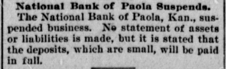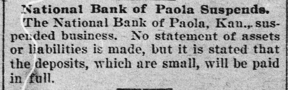 National Bank of Paola Suspends. The National Bank of Paola, Kan., suspended business. No statement of assets or liabilities is made, but it is stated that the deposits, which are small, will be paid in full.