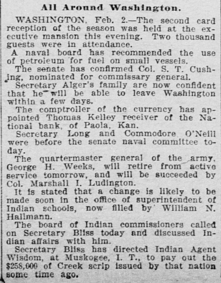 All Around Washington. WASHINGTON, Feb. 2.-The second card reception of the season was held at the executive mansion this evening. Two thousand guests were in attendance. A naval board has recommended the use of petroleum for fuel on small vessels. The senate has confirmed Col. S. T. Cushing, nominated for commissary general. Secretary Alger's family are now confident that he will be able to leave Washington within a few days. The comptroller of the currency has appointed Thomas Kelley receiver of the National bank, of Paola, Kan. Secretary Long and Commodore O'Neill were before the senate naval committee today. The quartermaster general of the army, George H. Weeks, will retire from active service tomorrow, and will be succeeded by Col. Marshall I. Ludington. It is stated that a change is likely to be made soon in the office of superintendent of Indian schools, now filled by William N. Hallmann. The board of Indian commissioners called on Secretary Bliss today and discussed Indian affairs with him. Secretary Bliss has directed Indian Agent Wisdom, at Muskogee, I. T., to pay out the $258,000 of Creek scrip issued by that nation some time ago.