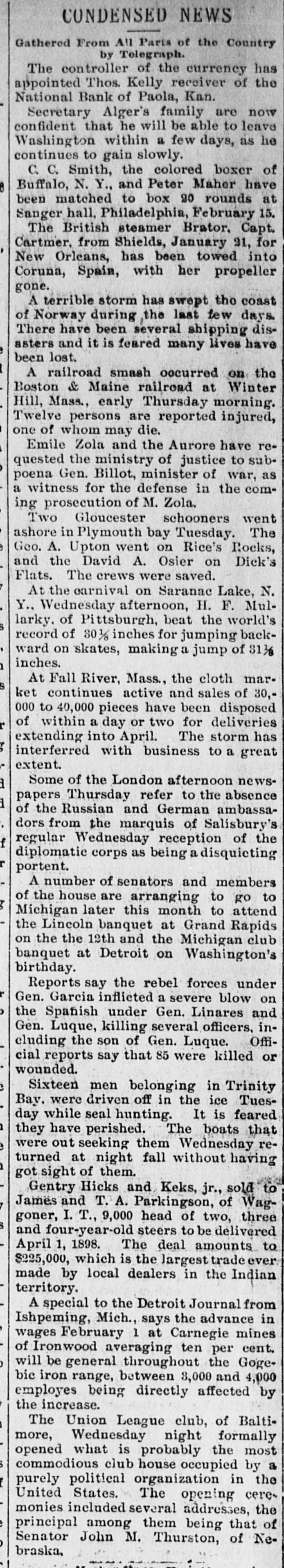 # CONDENSED NEWS Gathered From All Parts of the Country by Telegraph. The controller of the currency has appointed Thos. Kelly receiver of the National Bank of Paola, Kan. Secretary Alger's family are now confident that he will be able to leave Washington within a few days, as he continues to gain slowly. C. C. Smith, the colored boxer of Buffalo, N. Y., and Peter Maher have been matched to box 20 rounds at Sanger hall, Philadelphia, February 15. The British steamer Brator, Capt. Cartmer, from Shields, January 31, for New Orleans, has been towed into Coruna, Spain, with her propeller gone. A terrible storm has swept the coast of Norway during the last few days. There have been several shipping disasters and it is feared many lives have been lost. A railroad smash occurred on the Boston & Maine railroad at Winter Hill, Mass., early Thursday morning. Twelve persons are reported injured, one of whom may die. Emile Zola and the Aurore have requested the ministry of justice to subpoena Gen. Billot, minister of war, as a witness for the defense in the coming prosecution of M. Zola. Two Gloucester schooners went ashore in Plymouth bay Tuesday. The Geo. A. Upton went on Rice's Rocks, and the David A. Osier on Dick's Flats. The crews were saved. At the carnival on Saranac Lake, N. Y., Wednesday afternoon, H. F. Mullarky, of Pittsburgh, beat the world's record of 30⅛ inches for jumping backward on skates, making a jump of 31⅝ inches. At Fall River, Mass., the cloth market continues active and sales of 30,000 to 40,000 pieces have been disposed of within a day or two for deliveries extending into April. The storm has interferred with business to a great extent. Some of the London afternoon newspapers Thursday refer to the absence of the Russian and German ambassadors from the marquis of Salisbury's regular Wednesday reception of the diplomatic corps as being a disquieting portent. A number of senators and members of the house are arranging to go to Michigan later this month to attend the Lincoln banquet at Grand Rapids on the the 12th and the Michigan club banquet at Detroit on Washington's birthday. Reports say the rebel forces under Gen. Garcia inflicted a severe blow on the Spanish under Gen. Linares and Gen. Luque, killing several officers, including the son of Gen. Luque. Official reports say that 85 were killed or wounded. Sixteen men belonging in Trinity Bay, were driven off in the ice Tuesday while seal hunting. It is feared they have perished. The boats that were out seeking them Wednesday returned at night fall without having got sight of them. Gentry Hicks and Keks, jr., sold to James and T. A. Parkingson, of Wagoner, I. T., 9,000 head of two, three and four-year-old steers to be delivered April 1, 1898. The deal amounts to $225,000, which is the largest trade ever made by local dealers in the Indian territory. A special to the Detroit Journal from Ishpeming, Mich., says the advance in wages February 1 at Carnegie mines of Ironwood averaging ten per cent. will be general throughout the Gogebic iron range, between 3,000 and 4,000 employes being directly affected by the increase. The Union League club, of Baltimore, Wednesday night formally opened what is probably the most commodious club house occupied by a purely political organization in the United States. The opening ceremonies included several addresses, the principal among them being that of Senator John M. Thurston, of Nebraska.