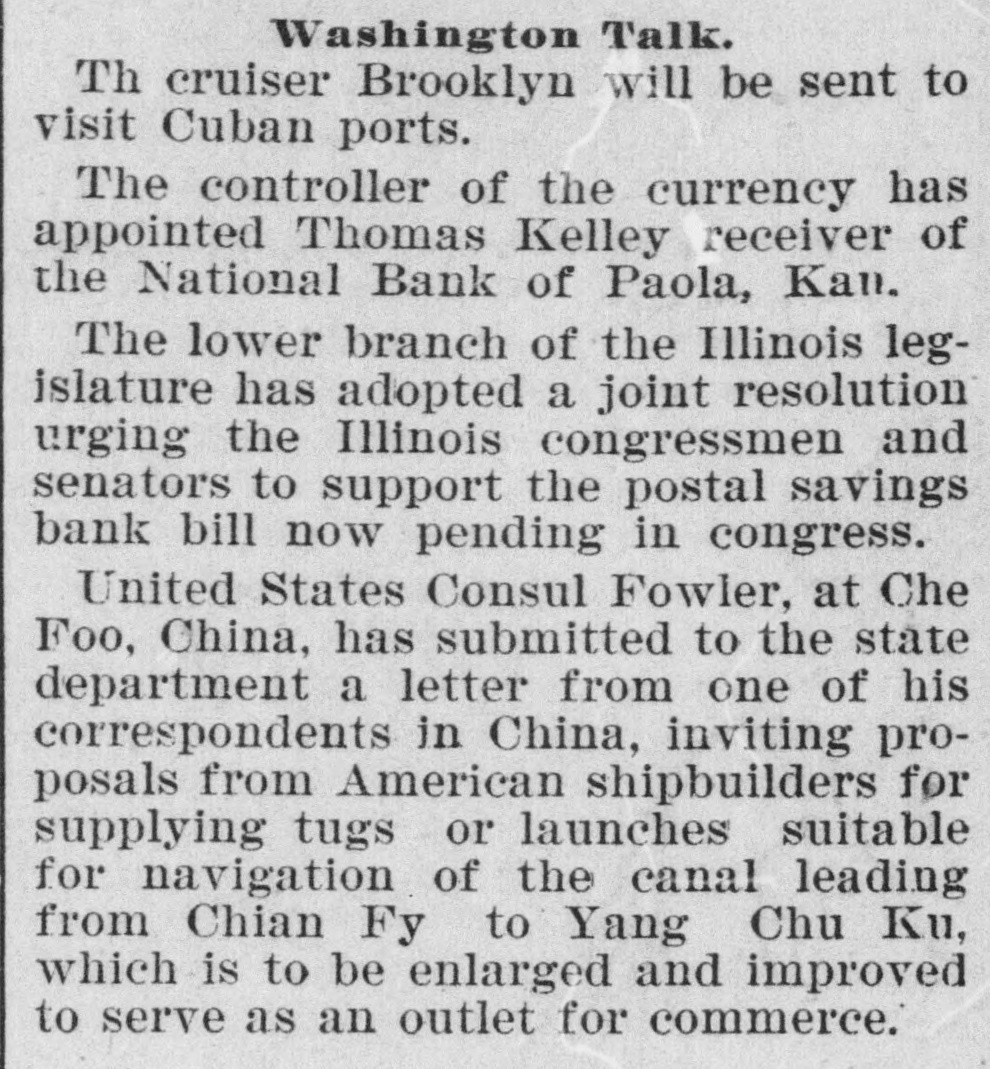 Washington Talk. Th cruiser Brooklyn will be sent to visit Cuban ports. The controller of the currency has appointed Thomas Kelley receiver of the National Bank of Paola, Kan. The lower branch of the Illinois legislature has adopted a joint resolution urging the Illinois congressmen and senators to support the postal savings bank bill now pending in congress. United States Consul Fowler, at Che Foo, China, has submitted to the state department a letter from one of his correspondents in China, inviting proposals from American shipbuilders for supplying tugs or launches suitable for navigation of the canal leading from Chian Fy to Yang Chu Ku, which is to be enlarged and improved to serve as an outlet for commerce.