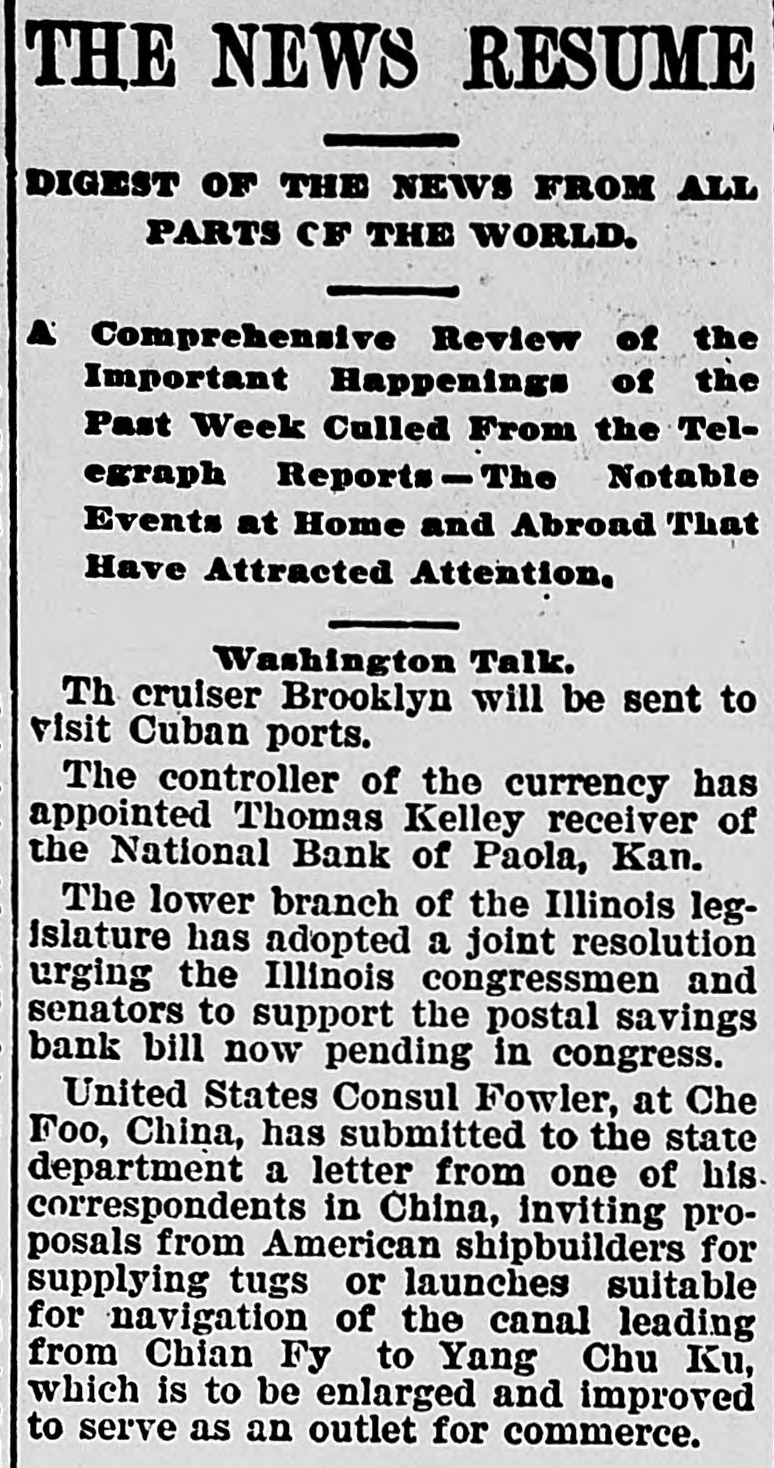 THE NEWS RESUME DIGEST OF THE NEWS FROM ALL PARTS CF THE WORLD. A Comprehensive Review of the Important Happenings of the Past Week Culled From the Telegraph Reports-The Notable Events at Home and Abroad That Have Attracted Attention. Washington Talk. Th cruiser Brooklyn will be sent to visit Cuban ports. The controller of the currency has appointed Thomas Kelley receiver of the National Bank of Paola, Kan. The lower branch of the Illinois legislature has adopted a joint resolution urging the Illinois congressmen and senators to support the postal savings bank bill now pending in congress. United States Consul Fowler, at Che Foo, China, has submitted to the state department a letter from one of his. correspondents in China, inviting proposals from American shipbuilders for supplying tugs or launches suitable for navigation of the canal leading from Chian Fy to Yang Chu Ku, which is to be enlarged and improved to serve as an outlet for commerce.
