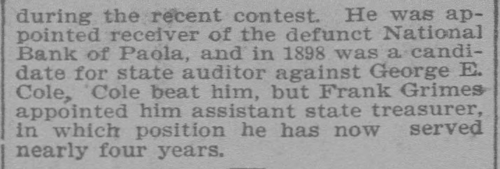 during the recent contest. He was appointed receiver of the defunct National Bank of Paola, and in 1898 was a candidate for state auditor against George E. Cole, Cole beat him, but Frank Grimes appointed him assistant state treasurer, in which position he has now served nearly four years.