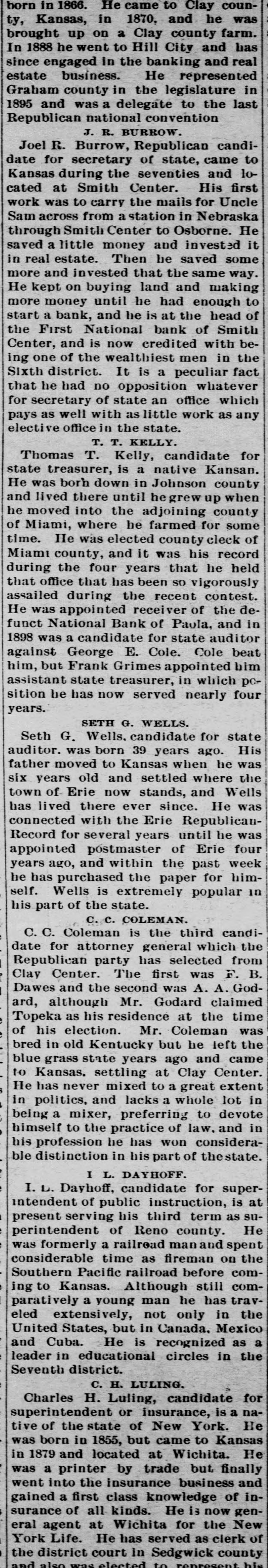 born in 1866. He came to Clay county, Kansas, in 1870, and he was brought up on a Clay county farm. In 1888 he went to Hill City and has since engaged in the banking and real estate business. He represented Graham county in the legislature in 1895 and was a delegate to the last Republican national convention J. R. BURROW Joel R. Burrow, Republican candidate for secretary of state, came to Kansas during the seventies and located at Smith Center. His first work was to carry the mails for Uncle Sam across from a station in Nebraska through Smith Center to Osborne. He saved a little money and invested it in real estate. Then he saved some more and invested that the same way. He kept on buying land and making more money until he had enough to start a bank, and he is at the head of the First National bank of Smith Center, and is now credited with being one of the wealthiest men in the Sixth district. It is a peculiar fact that he had no opposition whatever for secretary of state an office which pays as well with as little work as any elective office in the state. T. T. KELLY Thomas T. Kelly, candidate for state treasurer, is a native Kansan. He was born down in Johnson county and lived there until he grew up when he moved into the adjoining county of Miami, where he farmed for some time. He was elected county cleck of Miami county, and it was his record during the four years that he held that office that has been so vigorously assailed during the recent contest. He was appointed receiver of the defunct National Bank of Paola, and in 1898 was a candidate for state auditor against George E. Cole. Cole beat him, but Frank Grimes appointed him assistant state treasurer, in which position he has now served nearly four years. SETH G. WELLS Seth G. Wells, candidate for state auditor, was born 39 years ago. His father moved to Kansas when he was six years old and settled where the town of Erie now stands, and Wells has lived there ever since. He was connected with the Erie Republican-Record for several years until he was appointed postmaster of Erie four years ago, and within the past week he has purchased the paper for himself. Wells is extremely popular in his part of the state. C. C. COLEMAN C. C. Coleman is the third candidate for attorney general which the Republican party has selected from Clay Center. The first was F. B. Dawes and the second was A. A. Godard, although Mr. Godard claimed Topeka as his residence at the time of his election. Mr. Coleman was bred in old Kentucky but he left the blue grass state years ago and came to Kansas, settling at Clay Center. He has never mixed to a great extent in politics, and lacks a whole lot in being a mixer, preferring to devote himself to the practice of law, and in his profession he has won considerable distinction in his part of the state. I L. DAYHOFF I. L. Dayhoff, candidate for superintendent of public instruction, is at present serving his third term as superintendent of Reno county. He was formerly a railroad man and spent considerable time as fireman on the Southern Pacific railroad before coming to Kansas. Although still comparatively a young man he has traveled extensively, not only in the United States, but in Canada, Mexico and Cuba. He is recognized as a leader in educational circles in the Seventh district. C. H. LULING Charles H. Luling, candidate for superintendent or insurance, is a native of the state of New York. He was born in 1855, but came to Kansas in 1879 and located at Wichita. He was a printer by trade but finally went into the insurance business and gained a first class knowledge of insurance of all kinds. He is now general agent at Wichita for the New York Life. He has served as clerk of the district court in Sedgwick county and also was elected to represent his