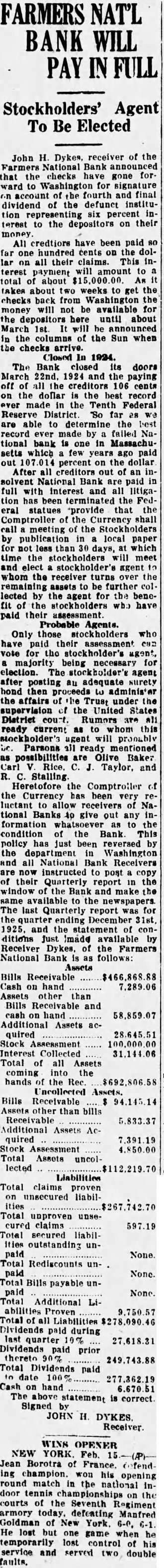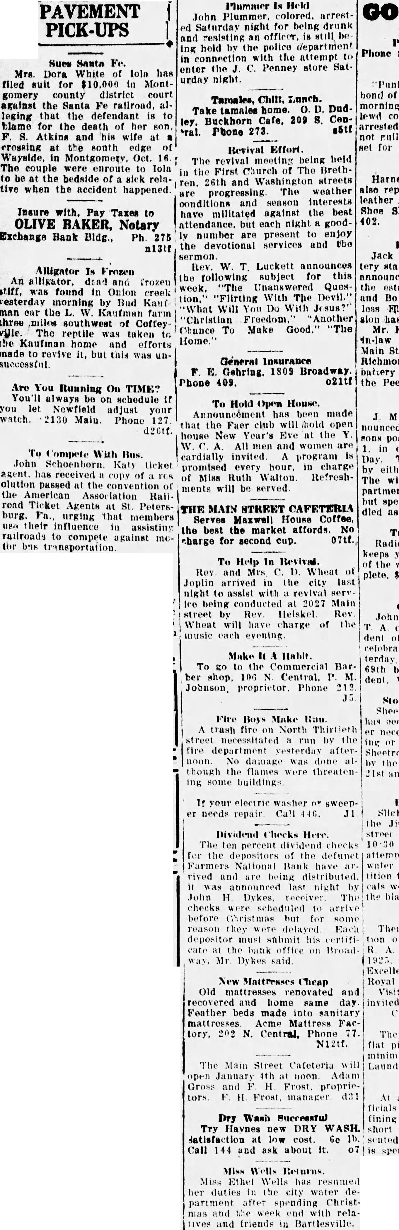 PAVEMENT PICK-UPS Sues Santa Fe. Mrs. Dora White of Iola has filed suit for $10,000 in Montgomery county district court against the Santa Fe railroad, alleging that the defendant is to blame for the death of her son. F. S. Atkins and This wife at crossing at the south edge of Wayside, in Montgomery. Oct. 16. The couple were enroute to Iola to be at the bedside of a sick relative when the accident happened. Insure with, Pay Taxes to OLIVE BAKER, Notary Exchange Bank Bldg., Ph 275 n13tf Alligator Is Frozen An alligator. dead and frozen stiff, was found in Onion creek vesterday morning by Bud Kauf man car the L. W. Kaufman farm three miles southwest of Coffeyville The rentile was taken to the Kaufman home and efforts made to revive it, but this was un- Are You Running On TIME? You'll always be on schedule If you let Newfield adjust your watch. 2130 Main. Phone 127. To Compete With Bus. John Schoenborn. Katy ticket agent. has received copy of res olution passed at the of the American Association Railroad Ticket Agents at St. Petersburg. Fa., urging that members USA their influence in assisting railroads to compete against mctor bus transportation Plummer Is Held John Plummer. colored. arrested Saturday night for being drunk and resisting an officer, is still be Ing held by the police department in connection with the attempt to enter the J. C. Penney store Saturday night. Take tamales home. 0. D. Dudley, Buckhorn Cafe, 209 S. Cen*ral. Phone 273. Revival Effort. The revival meeting being held in the First Church of The Brethren, 26th and Washington streets are progressing The weather conditions and season interests have militated against the best attendance. but each night a good. ly number are present to enjoy the devotional services and the Rev. W. T. Luckett announces the following subject for this week. "The Unanswered Question." "Flirting With The Devil." "What Will You Do With Jesus?' "Christian Freedom.' Another Chance To Make Good." "The Home." General Insurance F. E. Gehring. 1809 Broadway. Phone 409. To Hold Open House. Announcement has been made that the Faer club will hold open house New Year's Eve at the Y. W. A. All men and women are cardially invited A program is promised every hour, in charge of Miss Ruth Walton Refreshments will be served THE MAIN STREET CAFETERIA Serves Maxwell House Coffee, the best the market affords. No charge for second cup. 07tf. To Help In Revival. Rev and Mrs. C. D. Wheat of Joplin arrived in the city last night to assist with revival servIce being conducted at 2027 Main street by Rev. Heiskel Rev Wheat will have charge of the music each evening Make It A Habit. To go to the Commercial Barber shop, 106 N. Central, P. M. Johnson, proprietor. Phone 212. Fire Boys Make Ran. A trash fire on North Thirtieth street necessitated a run by the fire department yesterday afternoon No damage was done although the flames were threatening some buildings If your electric washer or sweeper needs repair Call 446. J1 Dividend Checks Here. The ten percent dividend checks for the depositors of the defunct Farmers National Bank have arrived and are being distributed it was announced last night by John H. Dykes, The checks were scheduled to arrive before Christmas but for some reason they were delayed. Each depositor must submit his certificate at the bank office on Broadway. Mr Dykes said New Mattresses Cheap Old mattresses renovated and recovered and home same day invited Feather beds made into sanitary mattresses Acme Mattress Factory, 202 N. Central, Phone 77. The Main Street Cafeteria will Laundry open January 4th at noon Adam Gross and F. H Frost proprietors F. H Frost. manager 431 Dry Wash Successful Try Havnes new DRY WASH. Satisfaction at low cost. 6c 1b. Call 144 and ask about It. 07 Miss Wells Returns Miss Ethel Wells has resumed her duties in the city water department after spending Christmas and the end with relalives and friends in Bartlesville.