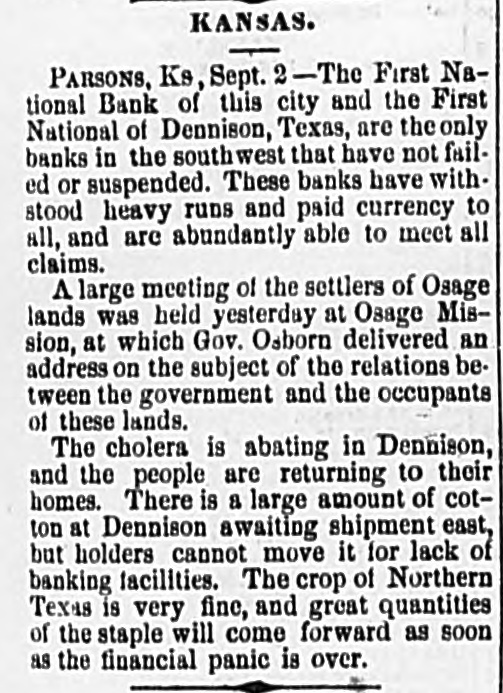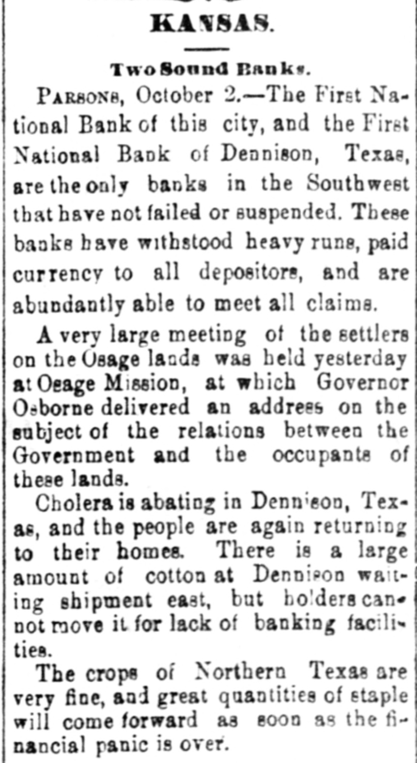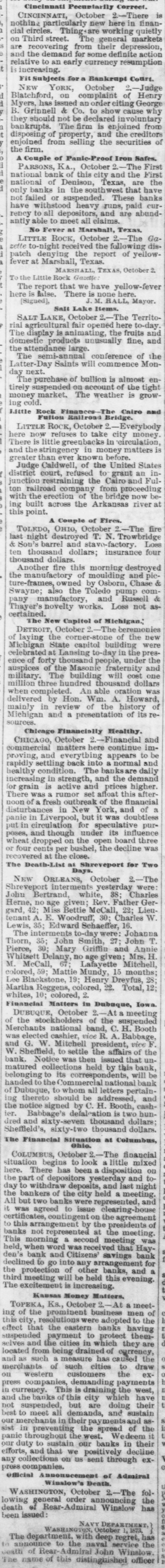 ny CINOINNATI, October 2.- -There is nothing partic cularly new here in finan cial circles. Thing are working quietly Third street The general markets are overing from their depr and the demand for some definite action relative to an early currency resumption increasing. Fit Subjects for Bankrupt Court. NEW YORK October Judge of Blatchford, complaint Henry Myers. has an order citing George B. Grinnell & Co. to show cause wh should not be declared bankrupts. The firm is enjoined from disposing of property, and the creditors enjoined from selling the securities the firm. A Couple of Panic-Proof Iron Safes, PARSONS. KA. October The First national bank of this city and the First national of Denison. Texas. are the banks in the southwest that have not failed suspended. These banks have withstood heavy runs, paid rency to all deposit and are abund antly able to meet all claims Fever No at Marshall, Texas, LITTLE Rock, October The Ga sette to-night received the following dis patch denying the report of yellow fever at Marshall Texas. October TEX AS, Rock Little The report that we have yellow -fever here false, There none here. HALL, [Sigued] Mayor. Salt Lake Items. SALT LAKE, October 2.- The Territo rial agricultural fair opened here to-day The display animating the fruits and domestic products unusually fine, and the attendance large The semi-annual conference of the Latter-Day Saints will commence Mon day next The purchase of bullion is almost en tirely suspended on account of the tight money market. The weather is grow ing cold. Little Rock The Caire FRIE LITTLE Rock. October Everybody take refuses now money city here in circulation little There greenbacks and the stringency money matters before. known Judge Caldwell, of the United States to refused grant district court, an junction restraining the Cairo and Ful ton railroad company from proceeding with the erection the bridge now ing built across the Arkansas river this point A Couple of Fires. TOLEDO OHIO, October The fire last night destroyed T. N. Trowbridge stave and factory & Sou's barrel ten thousand dollars: insurance four thousand dollars Another fire this morning destroyed the manufactory of moulding and pi ture-frames, owned by Osborn, Chase Swayne also the Toledo pump com and manufactory Russell pany Thayer's novelty works. Loss not certained The New Capitol of Michigan. The October DETROIT new of the the laying Michigan State capitol building Lansing to-day in the pres ence of forty people. under the auspices of the Masonic fraternity and military. The building will cost million three hundred thousand dollars when An able oration was delivered by Hon Wm. A. Howard mainly in review of the history Michigan and a presentation of its reChienge Financially Healthy October Financial CHICAGO and commercial matters here continue imeverything proving, appears and rapidly settling back into normal and healthy The banks are daily increasing in strength and the demand and prices active for higher grain is rumor affoat There this afterset noon fresh outbreak of the financial New York and in of panic Liverpool, but was put in circulation for speculative purposes, and though under its influence wheat dropped on the open board three four cents per bushel, the decline was covered at the close. The Death-List Sh report for Two Days. NEW ORLEANS, October 2. The interment yesterday were John Bertrand white, 38 Charles Herne, age Rev Father Gergard, 42; Miss Bettie McCall 22; Woodruff 30: Charles W Lewis, Edward Schaeffer, 16. The interments to-day were: Johanna Thorn. John Smith 27 John Pierce, Mary Griffin and Whitset Delany no age given Mrs. H Mitchell Lafavette McCall, Mattie Mundy. months Blac ekstone, 19: Henry Dreyfus, Martha Reggens, colored, 22 Total, whites, colored. Financial Matters in Dubuque, Iowa DUBUQUE, October meeting the stockholders of the Merchants national band. C H. Booth cashier. R. Babbage and G. W Mitchell W. Sheffield, to settle the affairs of the bank. Notice was then issued that matured collect ions held by this bank belonging to its corres dents, will be handed to the Commen national bank Dubuque, to whom all letters pertain thereto should be and the notice signed by C H Booth, cashBabbage's defal ation two hunand sixty-seven thousand dollars Sheffield's, sixty-two thousand dollars The Financial at Columbus, Ohio. COLUMBUS October 2. The financial situation begins to look little mixed here. There has been disposition part depositors yesterday and to day to withdraw deposits, and last night the bankers of the city held meeting but two were bank and represented. to was issue agreed -house clearing on the agreement this rangement by the presidents of banks not represe at the meeting. This morning second meeting was held, when word was recei ved that Hayden's bank and Citizens' savings bank declined to go into any for the protection of other banks. and a third meeting will be held this evening. The excitement is increasing Kausas Money Matters. TOPEKA Ks., October At a meeting of the prominent business men of city, were adopted to the effect that the eastern banks having to suspended protect thempayment and the cities which they are located from being drained of purrency such measure has caused the merchants of such cities draw western customers the express companies, demanding payments currency. This draining the west. and the banks of this city which have not suspended, but are doing their best meet all demanda, and sustain our merchants in their payments and as sist in preventing the spread of the panic the west. Wedeem duty to sustain our banks in their efforts,and that we positively decline any collections on us sent through ex press companies official of Admiral Winslow's Death W ASHINGTON, October 2- The folgeneral order lowing announcing the death of Rear Admiral Winslow has been issued NAVY DEPARTMENT WASHIN The department. with deep regret, has nounce to the naval service the Real amiral John Winslow name of this 