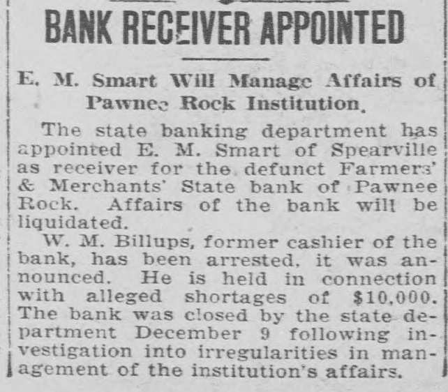 BANK RECEIVER APPOINTED E. M. Smart Will Manage Affairs of Pawnee Rock Institution. The state banking department has appointed E. M. Smart of Spearville as receiver for the defunct Farmers' & Merchants' State bank of Pawnee Rock. Affairs of the bank will be liquidated. W. M. Billups, former cashier of the bank, has been arrested. it was announced. He is held in connection with alleged shortages of $10,000. The bank was closed by the state department December 9 following investigation into irregularities in management of the institution's affairs.