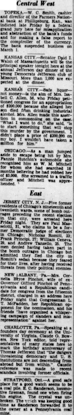 Central West TOPEKA C. Smith cashier and director of the Farmers Nationbank at Phillipsburg, Kan., indicted late Friday federal grand jury here misapplication and of the bank's for making a false report to the comptroller of the currency The bank suspended business on March KANSAS CITY -Senator Daid I Walsh of Massachusetts will be the principal speaker here at the annual Jefferson day dinner the young club Missouri More than 1,000 are expected at the dinner. KANSAS CITY liquorthe aim Mrs IsaC. 56, who Friday for an of $200,000 she alleged her son died drinking industrial alcohol. Mrs. Allen made this assertion in the want to she said to start that will stop this murder by government didn' place of on my boy wouldn't have taken million for CHICAGO man jumped aside to escape being hit by Mrs. Fannie Hutchin's she recognized him as W M. Mitchell for had searched 18 he had robbed her of $3,000 to traffic officer and Mitchell was appre- East JERSEY CITY, N. former residents of Chicago's and twentieth wards scene of bomb preceding the recent election in that were Friday night They are Paul Mas- here 31. who claims to be for mer Democratic judge of in Chicago Nicholas Frank Principi, 27: William 33; 29, and Andrew Tanzello, 25. The men the bomb denied having taken part in Chicago but admitted they fled the city Romiti's they feared for their after having received threats from their political enemies NEW ALBANY Cornelia wife ex Governor of Pennsylvania and Republican candidate for congress from the fifteenth district, charged in an address here Friday night that Congressman T. McFadden. her Republican ponent for the nomination. and ing friends organized whispercampaign of slanders and misrepresentation against her. CHARLOTTE Speaking at founders day ceremony the University of Virginia, Claude G. Bow ers. New York editor told representatives of many states here mark the birthday Thomas Jefferson that "the dangers threatening and institutions are not descending from abroad but from within Caustic reference made to recent scandals involving former officials. STRATFORD good safe place for watch to tive fireman, found one when firing his The crystal was unbroken. which was keeping good time as Sanderson forwarded the owner at a Pennsylvania coal mine.