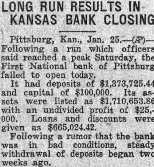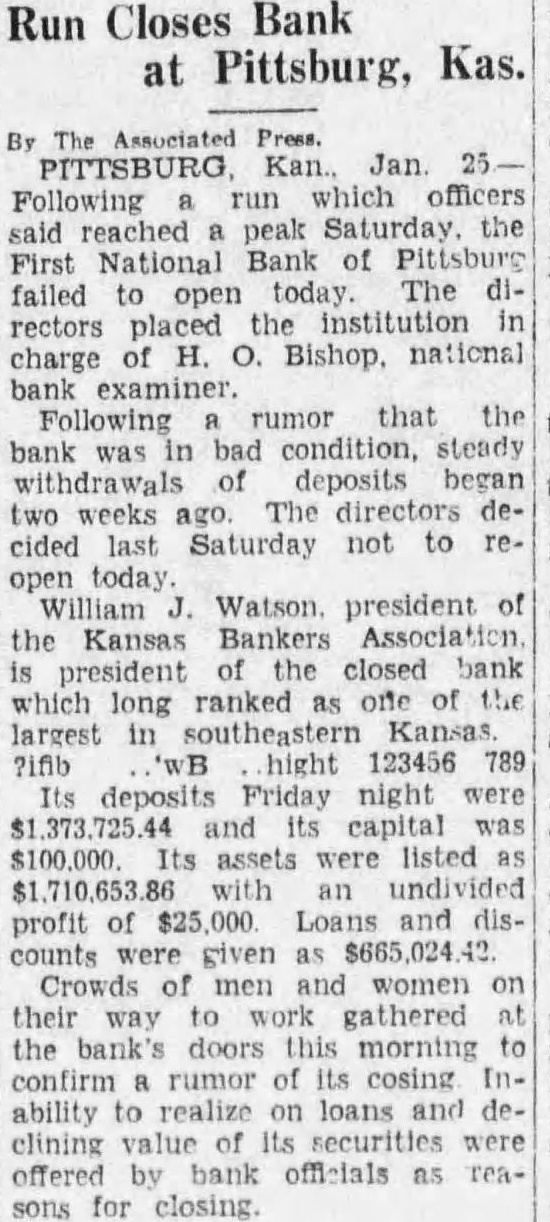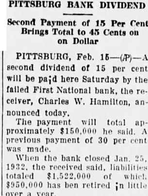 Pittsburg.-A second dividend of 15 per cent was paid here recently by the failed First National Bank, the receiver, Charles W. Hamilton, announced. The payment will total approximately $150,000. A previous pay. ment of 30 per cent was made.
