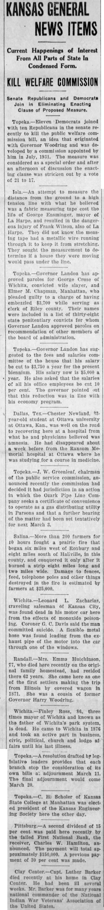 Topeka.-Governor Landon has suggested to the fees and salaries committee of the house that his salary be cut to $3,750 a year for the present biennium. His salary now is $5,000 a year. He also asked that the salaries of all his office employees be cut 10 per cent. The governor pointed out that this reduction was in line with his economy program. year-old student at Ottawa university at Ottawa, Kan., was well on the road to recovering here at a hospital from what he and physicians believed was amnesia. He had disappeared about a week before from the Ransom Memorial hospital at Ottawa where he was studying for a course in medicine.