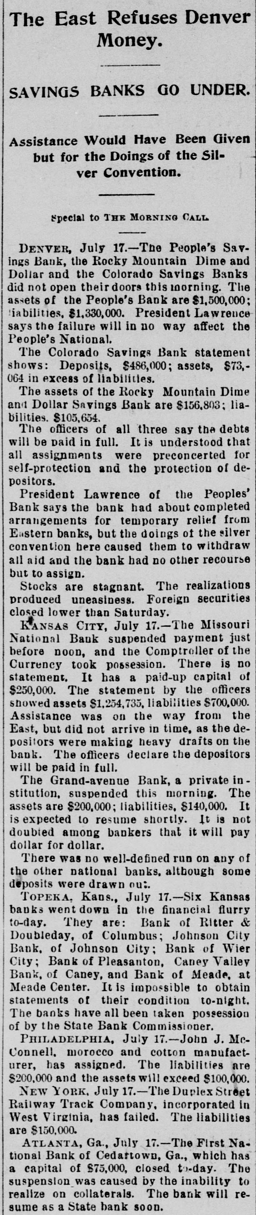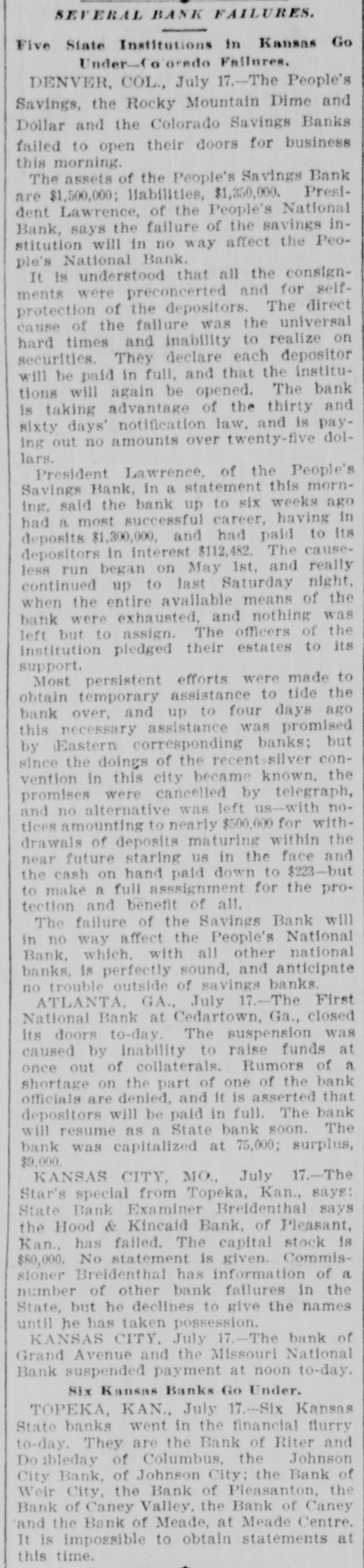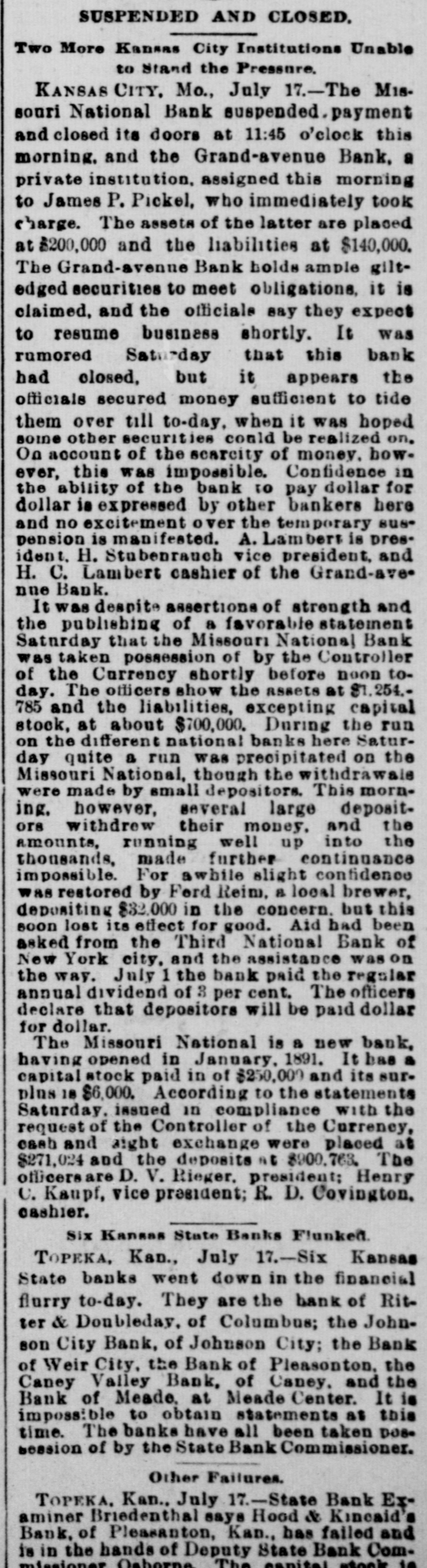 SUSPENDED AND CLOSED. Two More Kansas City Institutions Unable to Stand the Pressure. KANSAS CITY, Mo., July 17.-The Mis. souri National Bank suspended.payment and closed its doors at 11:45 o'clock this morning. and the Grand-avenue Bank, a private institution. assigned this morning to James P. Pickel, who immediately took charge. The assets of the latter are placed at $200,000 and the liabilities at $140,000. The Grand-avenne Bank holds ample giltedged securities to meet obligations, it is claimed, and the officials say they expect to resume business shortly. It was rumored Sat day that this bank had closed, but it appears the officials secured money sufficient to tide them over till to-day. when it was hoped some other securities could be realized on. On account of the scarcity of money. bow. ever, this was impossible. Confidence in the ability of the bank to pay dollar for dollar is expressed by other bankers here and no excitement over the temporary sus* Dension is manifested. A. Lambert is president. H. Stubenrauch vice president, and H. C. Lambert cashier of the Grand-ave nue Bank. It was despite assertions of strength and the publishing of a favorable statement Saturday that the Missouri National Bank was taken possession of by the Controller of the Currency shortly before noon today. The officers show the assets at $1.254.785 and the liabilities, excepting capital stock, at about $700,000. During the run on the different national banks here Saturday quite a run was precipitated on the Missouri National, though the withdrawais were made by small depositors. This morning. however, several large depositors withdrew their money. and the amounts, running well up into the thousands, made further continuance impossible. For awhile slight confidence was restored by Ford Reim, a local brewer, depositing $32.000 in the concern. but this soon lost its effect for good. Aid had been asked from the Third National Bank of New York city, and the assistance was on the way. July 1 the bank paid the regular annual dividend of 3 per cent. The officers declare that depositors will be paid dollar for dollar. The Missouri National is a new bank, having opened in January. 1891. It has a capital stock paid in of $250,000 and its surplus 18 $6,000. According to the statements Saturday. issued in compliance with the request of the Controller of the Currency, cash and sight exchange were placed at $271,024 and the deposits at $900,763. The officersal D. V. Rieger. president; Henry C. Kaupf, vice president; R. D. Covington. cashier. Six Kaneas State Banks Flunken TOPEKA, Kan., July 17.-Six Kansas State banks went down in the financial flurry to-day. They are the bank of Ritter & Doubleday, of Columbus; the Johnson City Bank, of Johnson City; the Bank of Weir City, the Bank of Pleasonton, the Caney Valley Bank, of Caney. and the Bank of Meade. at Meade Center. It is impossible to obtain statements at this time. The banks have all been taken DOB. session of by the State Bank Commissioner. Other Failures. TOPEKA. Kan.. July 17.-State Bank Examiner Briedenthal says Hood & Kincaid's Bank, of Pleasanton, Kan., has failed and is in the hands of Deputy State Bank Commissioner Oshorna The canital stock in
