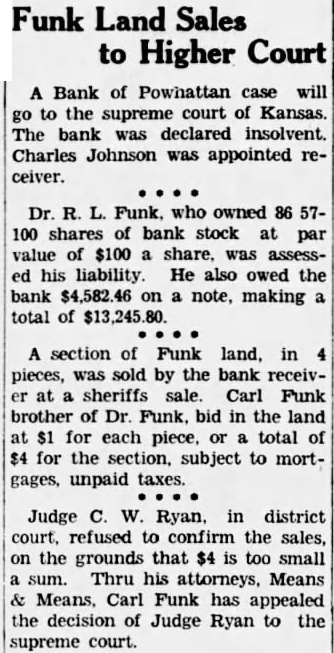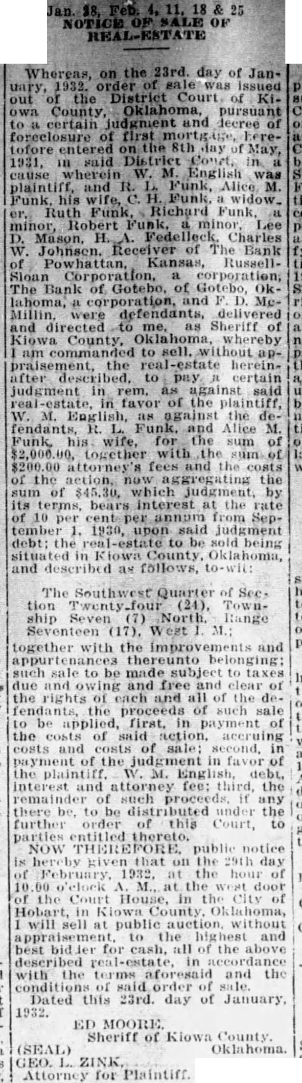 Whereas, on the 23rd. day of Janout District Court KiCounty, Oklahoma, pursuant certain judgment decree foreclosure first 1931, said cause English plaintiff, and R. Funk, Alice M. his Funk, widow. Richard Lee Mason, Charles Receiver of Bank Powhattan, Kansas, RussellThe Gotebo, of corporation, and Mewere defendants, delivered and directed Sheriff County, Oklahoma, commanded sell. appraisement, the real-estate hereincertain judgment as against the fendants, R. Funk. Alice wife, sum the aggregating the sum of which judgment, its bears at rate 10 cent per judgment County as follows,