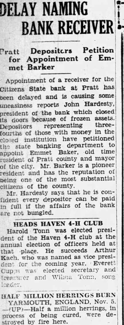 DELAY NAMING BANK RECEIVER Pratt Depositers Petition for Appointment of Emmet Barker Appointment of a receiver for the Citizens State bank at Pratt has been delayed and is causing some uneasiness reports John Hardesty, president of the bank which closed its doors because of frozen assets. Depositors representing threefourths of those with money in the closed institution have petitioned the state banking department to appoint Emmet Baker, old time resident of Pratt county and mayor of the city. Mr. Barker is pioneer resident and has the reputation of being one of the most substantial citizens of the county Mr. Hardesty says that he is confident every depositor can be paid in full if the affairs of the bank are not bungled. HEADS HAVEN 4-H CLUB Harold Tonn was elected president of the Haven 4-H club at the annual election of officers held at that place. He succeeds Arthur Kach. who was named as vice president for the coming year. Everett Cupps was elected secretary and treaswer and Wilma Tonn, song HALF MILLION HERRINGS BURN YARMOUTH, ENGLAND. Nov. 5. -(UP)-Half million herrings, in process of being cured, were destroyed by fire here.