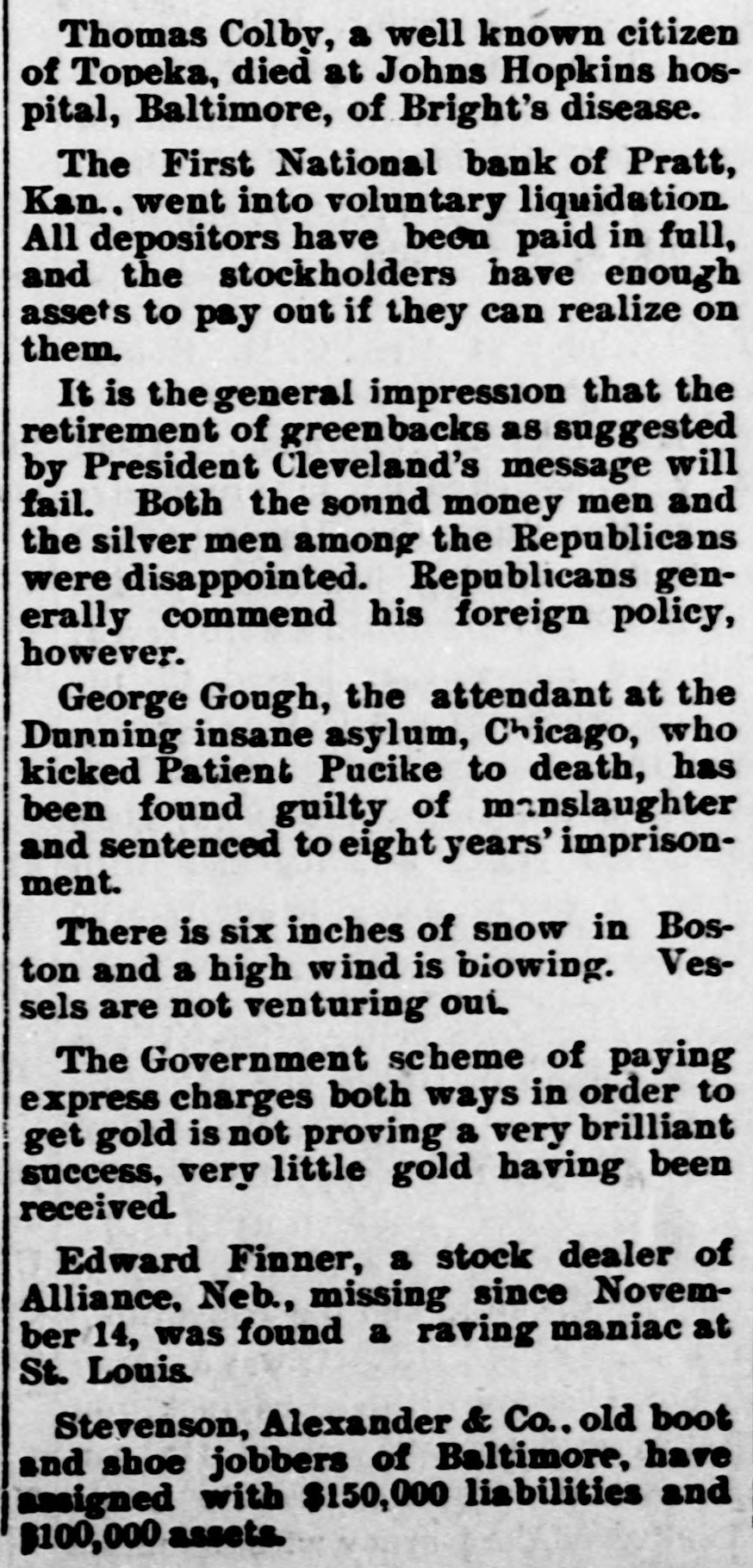 Thomas Colby, a well known citizen of Topeka, died at Johns Hopkins hospital, Baltimore, of Bright's disease. The First National bank of Pratt, Kan.. went into voluntary liquidation. All depositors have been paid in full, and the stockholders have enough assets to pay out if they can realize on them. It is the general impression that the retirement of greenbacks as suggested by President Cleveland's message will fail. Both the sound money men and the silver men among the Republicans were disappointed. Republicans generally commend his foreign policy, however. George Gough, the attendant at the Dunning insane asylum, Chicago, who kicked Patient Pucike to death, has been found guilty of manslaughter and sentenced to eight years' imprisonment. There is six inches of snow in Boston and a high wind is biowing. Vessels are not venturing out The Government scheme of paying express charges both ways in order to get gold is not proving a very brilliant success, very little gold having been received. Edward Finner, a stock dealer of Alliance, Neb., missing since November 14, was found a raving maniac at St. Louis. Stevenson, Alexander & Co., old boot and shoe jobbers of Baltimore, have assigned with $150,000 liabilities and $100,000 assets.