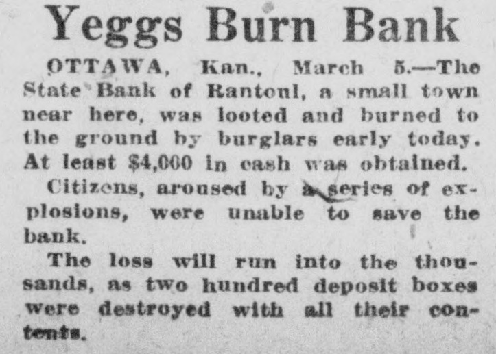 Yeggs Burn Bank OTTAWA, Kan., March 5.-The State Bank of Rantoul, a small town near here, was looted and burned to the ground by burglars early today. At least $4,000 in cash was obtained. Citizens, aroused by à series of explesions, were unable to save the bank. The loss will run into the thousands, as two hundred deposit boxes were destroyed with all their contents.