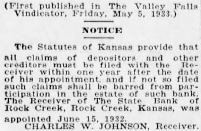 (First published in The Valley Falls Vindicator, Friday. May 5. 1933.) NOTICE The Statutes of Kansas provide that all claims of depositors and other creditors must be filed with the Receiver within one year after the date of his appointment and if not 80 filed such claims shall be barred from participation in the of such bank. The Receiver The State Bank of Rock Creek, Rock Creek, Kansas, was appointed June CHARLES W JOHNSON. Receiver.