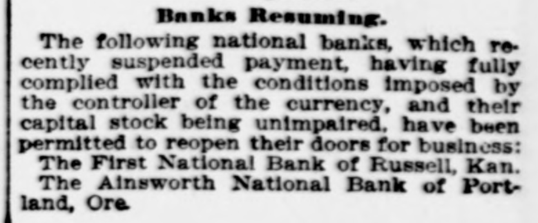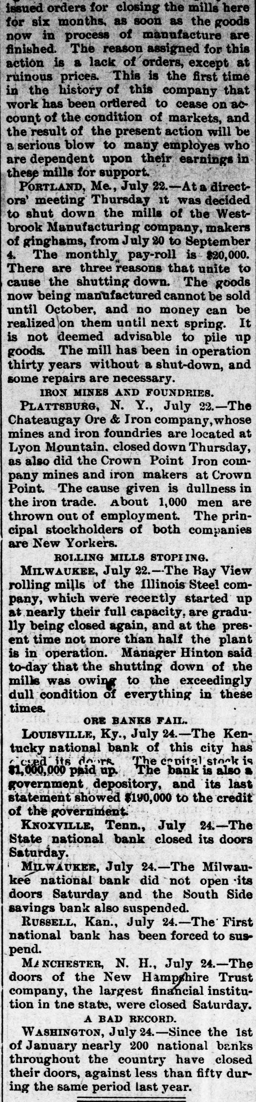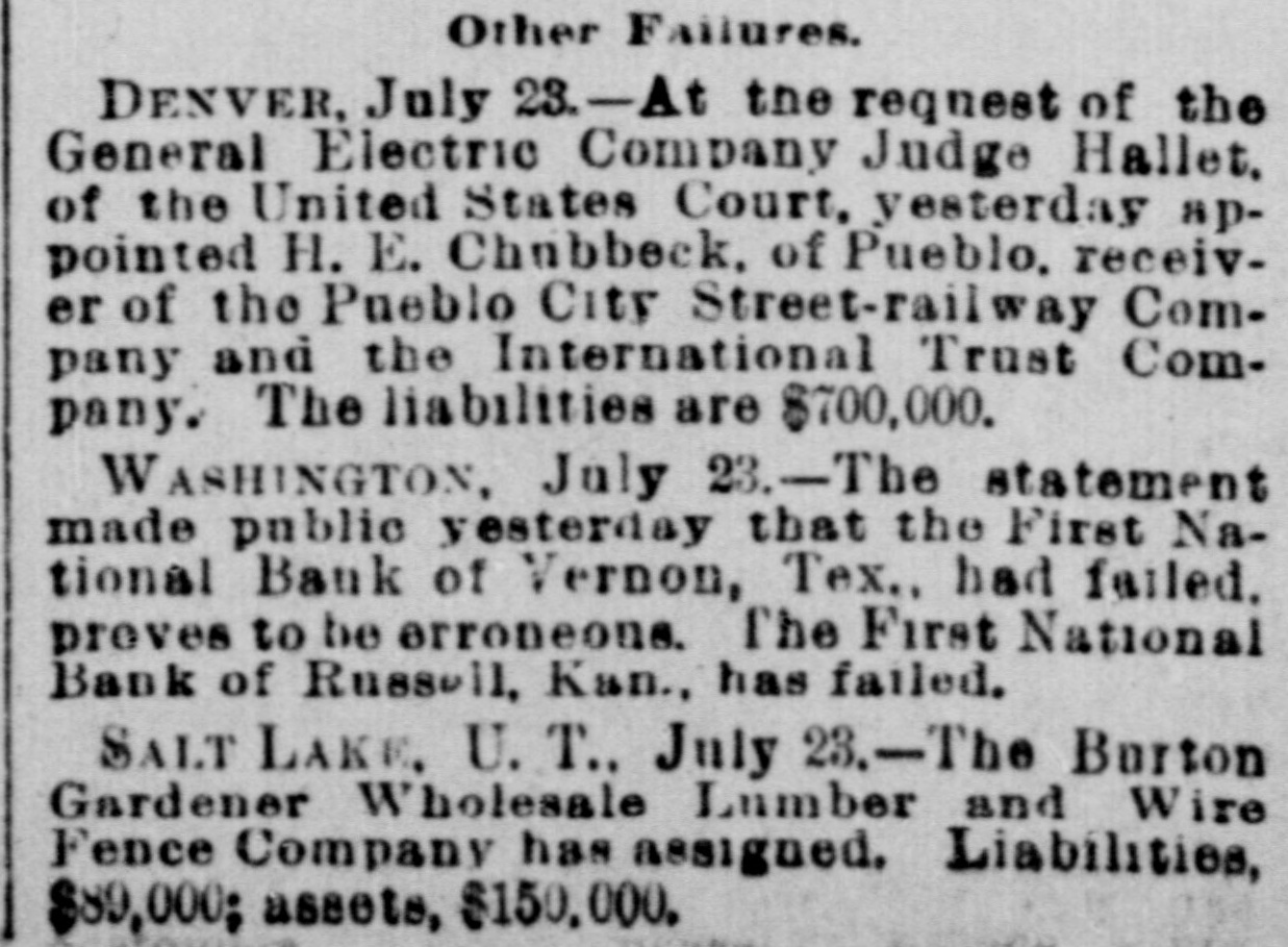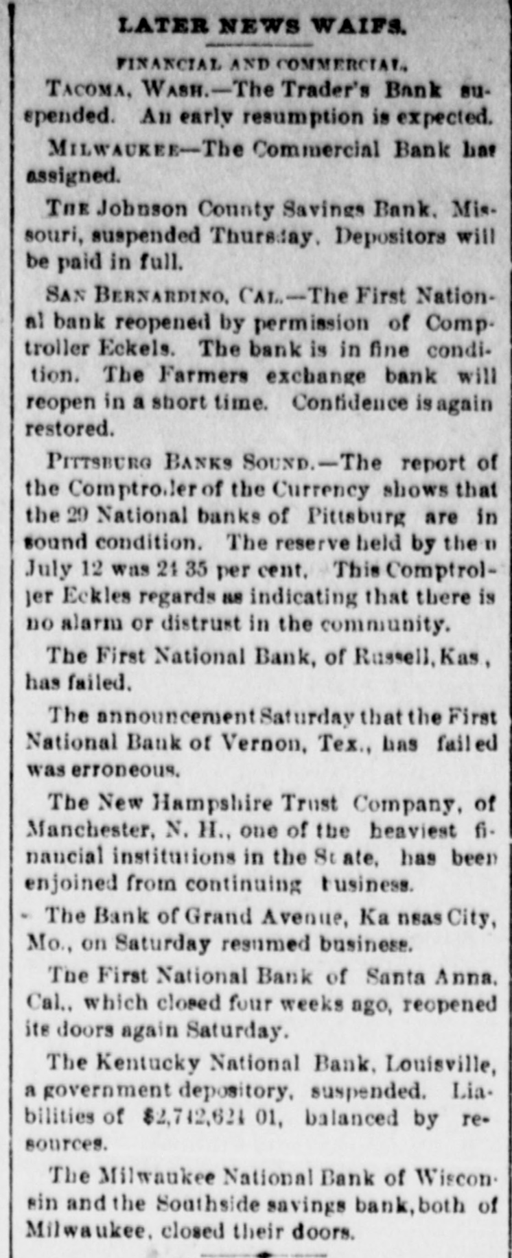 Also National Banks of Tennessee, Texas and Wisconsin Forced to the Wall. LOUISVILLE, KY., July 22.-The Kentucky National Bank, of this city, closed its doors this morning. The capital stock is $1,000,000. paid up. This bank is also a Government depository, and its last statement show $190,000 to the credit of the Government The loans and discounts outstanding amounted to $1,719,366, and the surplus was $108,500. It is thought that the bank will be able to resume business in a short time. It has been carrying an immense amount of paper, which, although gilt edge, could not be realized on. The bank is the Government depository, and in the statement of the bank. published July 19th, the Government's deposits are placed at $191,731. Deposits of the United States disbursing officers, $138,268. According to the statement, the amount of cash on hand July 19th was a little over $85,000, Individual deposits subject to check of $311,693. and the loans and discounts were $1,719,966. The bank got into serious trouble in the fall of 1890, by having very heavy deposits from the country banks. which were checked so rapidly as to threaten a suspension of the bank. It has never recovered from that trouble, and its failure has been expected for several months. No other banks are hurt. The Kentucky National Bank was a United States depository, and has Government deposits amounting to about $300,000, and its inability to make prompt transfers on this account was the immediate cause of the suspension to-day. During the past three years its surplus has been changed off from $300,000 to $100,000. The officers and directors do not expect to resume for some time, if at all, and it is generally thought that it will not resume at all, unless it should be entirely reorganized. ⑉ Bank Examiner Escott b-right authorizes the official statement that he has examined all the national banks in Louisville, and its vicinity, and they are all solvent. and most of them in very good condition. Future trouble is not expected, unless the small depositors, mainly Germans, become frightened over Sunday and start runs on the banks having large numbers of small depositors. KNOXVILLE, TENN July 22.-The State National Bank closed this morning after opening four minutes. notice was posted on the door saying: "This bank has closed for liquidation. Depositors will be paid in full. The State National Bank, of this city, closed its doors this morning. The bank has long been known to be the weakest in the city. Yesterday, when $20,000 in deposits were withdrawn. it was more than it could stand. A meeting of the directors was held last night. An offer of $40,000 to pay depositors should a run occur to-day was made by other banks. The offer was not accepted, however. When it opened for business this morning a run was precipitated, which only lasted a few minutes, as the bank closed its doors for liquidation. A notice on the door says it will pay depositors dollar for dollar. The stock holders will also receive 85 cents on the dollar. It was feared that the closing of the State National would cause a panic in Knoxville financial circles, which have heretofore been considered very strong. A slight run was only made on the City National Bank, which is just opposite the street, but depositors were paid in full. The scare was soon over. There is no more uneasiness felt here. LAMPASAS, TEX., July 22. The private banking house of J. & L W. Galbraith failed to open its doors yesterday, having made an assignment to Camp bell. Liabilities, $60,000; assets, $120,000. A run on the First National Bank was started, but it was fortunately in position to withstand all demands. The depositors in the Galbraiths' bank will be paid in full. DENVER, COL., July 22.-On petition of the General Electric Company, Judge Hallett, in the United States Court to-day appointed E. B. Shattuck, of Pueblo, receiver of the Pueblo City Railway Company and the International Trust Company. The liabilities of the company are placed at $700,000. VERNON, TEX. July 22.-The State National Bank or Vernon closed its doors yesterday. Every cent of money was paid out. except ten cents, before the doors were closed. The failure is due to the inability to realize on securities. The directors state that depositors will be paid in full. MILWAUKEE, WIS. July -The Milwaukee National Bank closed its doors this morning. MILWAUKEE, WIS., July 22.-The Southside Savings Bank did not open its doors this morning. TOPUKA, KAN., July -The First National Bank of Anthony closed its doors yesterday. Assets, $154,000; liabilities, $50,000. MEMPHIS, TENN., July 22.-The Citizens' Bank, of Jellico, Tenn., the only banking institution in that place, failed to open for business yesterday. GREELEY, COL. July 22. The Union Bank made an assignment yesterday. It is thought the step was voluntarily taken to avoid a contingency that might arise should some creditor take advantage of the attachment law. The bank is perfeetly solvent, and not one depositor will lose a dollar. RUSSELL KAN., July 22 The First National Bank, of this place, closed this afternoon, and was taken possession of by C. M. Sawyer, on the order of the Comptroller of the Currency. No statement is made. Run on a Homestead Bank. HOMESTEAD, PA., July 22.-A run of mada on the