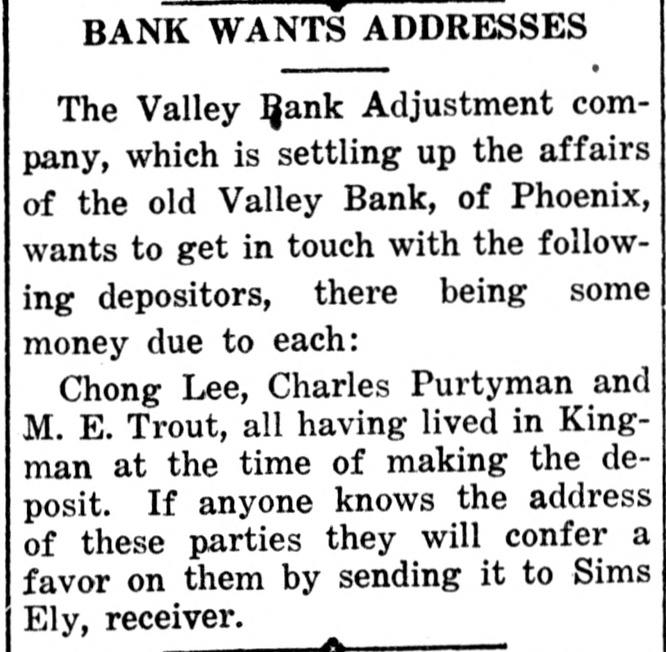but the precise amount cannot 1 predicted in advance. The assets which remain to be disposed of are in the main worthless; but there are a few items on which it is expected something may be realized. After reserving such assets as are known to have some value and on which collection may be made within the next few months, the remaining assets (of large face value but of no actual value and quite generally worthless) will be offered for sale in bulk. Any sum realized therefrom will necessarily be small. The depositors of the old Valley bank ("Valley Bank of Phoenix") who with fine public spirit and good business sense organized The Valley Bank Adjustment company and thereby saved the greater part of their deposits, deserve congratulation on this outcome, At the outset they got in cash 75 per cent of their deposits. An additional sum of approximately 5 per cent was returned to them almost immediately; and now. with the dividend of today and the final disbursement to be made later, their loss is extremely small in comparison with what it would have been had they failed to organize the adjustment company. The alternative would have been a receivership; and under a receivership the depositors would have sustained a heavy loss. Some 2,500 depositors of the old bank joined in forming the adjustment company, and while most of them thoroughly understood the purposes and details of the plan. it is apparent that some of them did not understand, and do not now understand it. It seems worth while. therefore, to state clearly just what was done to save the situation. The depositors who took part in the preliminary investigation quickly found that the failure was a bad one. The one step to take to prevent it from becoming a disastrous failure was to effect some form of reorganization of the failed bank. A very wealthy group of men who already owned other banks in Arizona, which banks were strong and prosperous. were approached with requests to look into the affairs of the failed bank with a view to taking it over and reopening it for business. These bankers made a careful analysis of the assets and liabilities of the failed concern. They reached the conclusion that of the assets of the failed bank there were notes, stocks, etc., of a face value of $869,000, which they would refuse to take into the proposed new bank. In their opinion there might be realized, in time, from this $869,000 as much as $212,000. The remainder of this $869,000 would, in their best judgement, be a total loss. The whole sum of $869,000 had to be provided for, however, inasmuch as it was proposed that these wealthy bankers would organize a new bank (The Valley Bank of today) and pay In full the liabilities of the failed bank. It was decided by the committee of depositors and the bankers with whom they were negotiating, that payment of the $869,000 would be made in the following manner: The capital and surplus of the old
